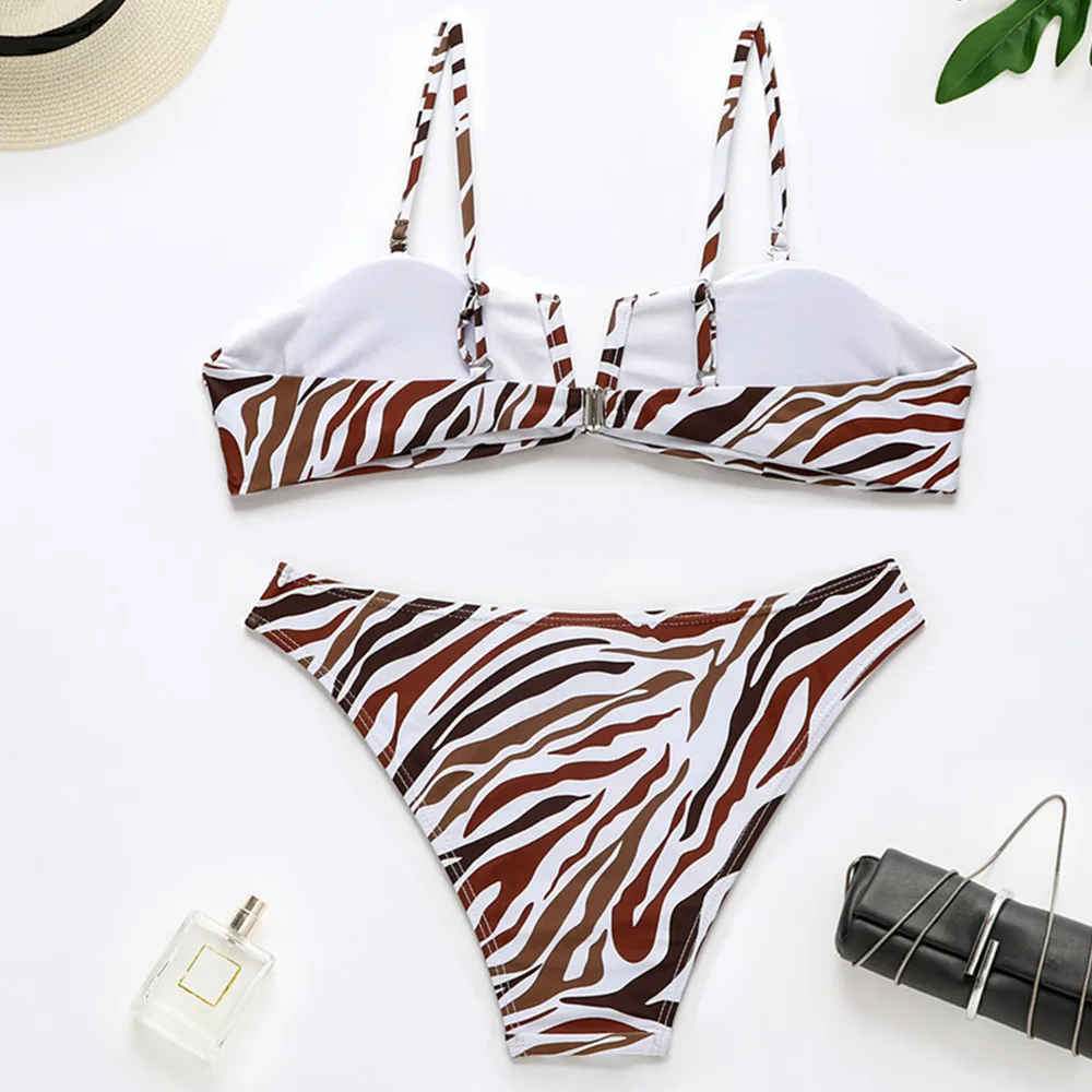 Женский купальник из 2 предметов, бразильский бандажный купальник с эффектом пуш-ап и открытой спиной, купальник с завышенной талией, бикини с принтом зебры