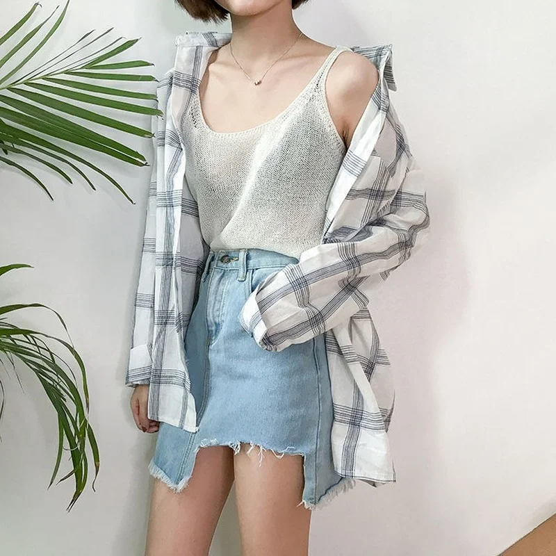 Блузка женская в клетку, шикарная летняя Солнцезащитная рубашка в с...