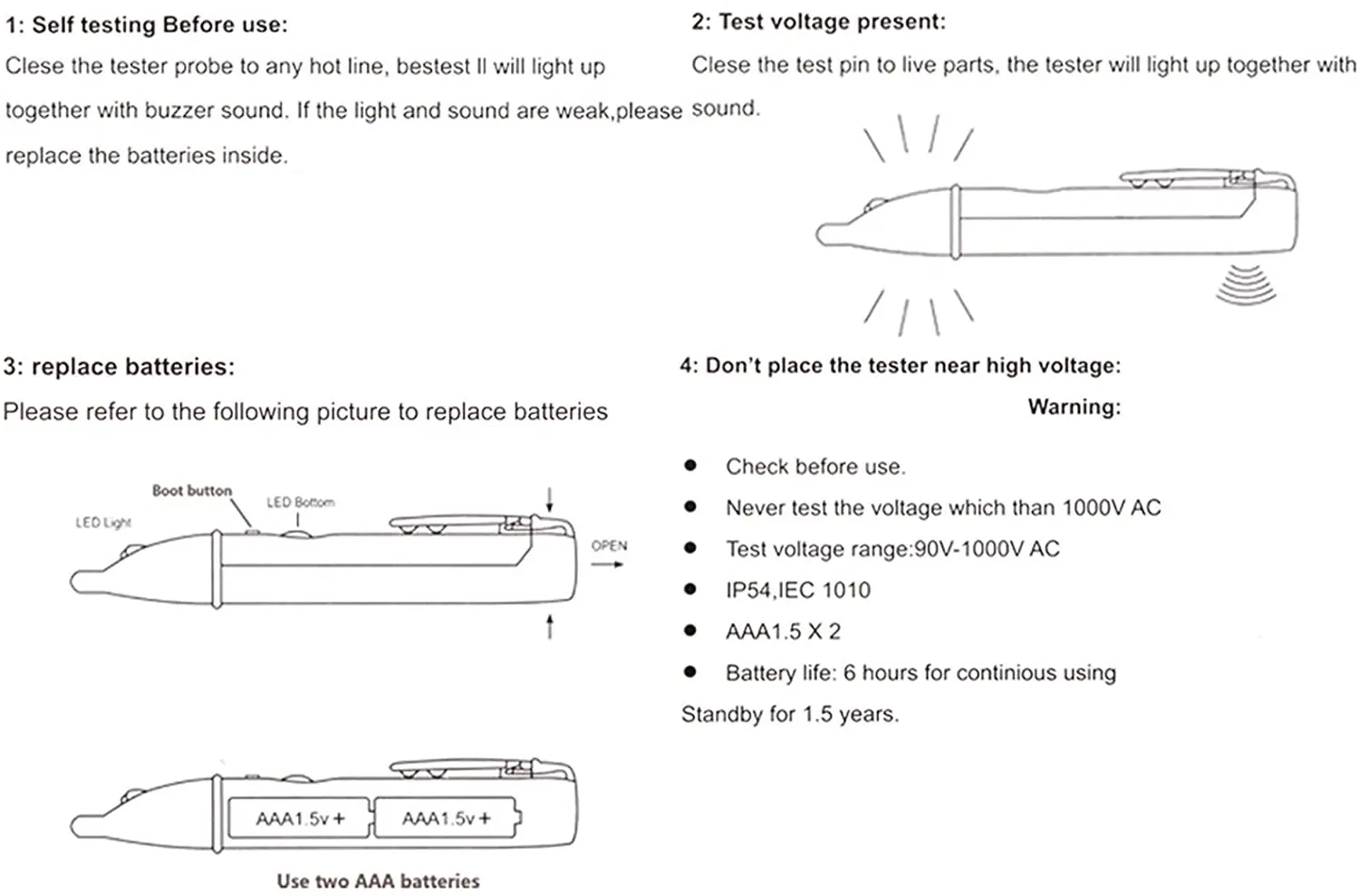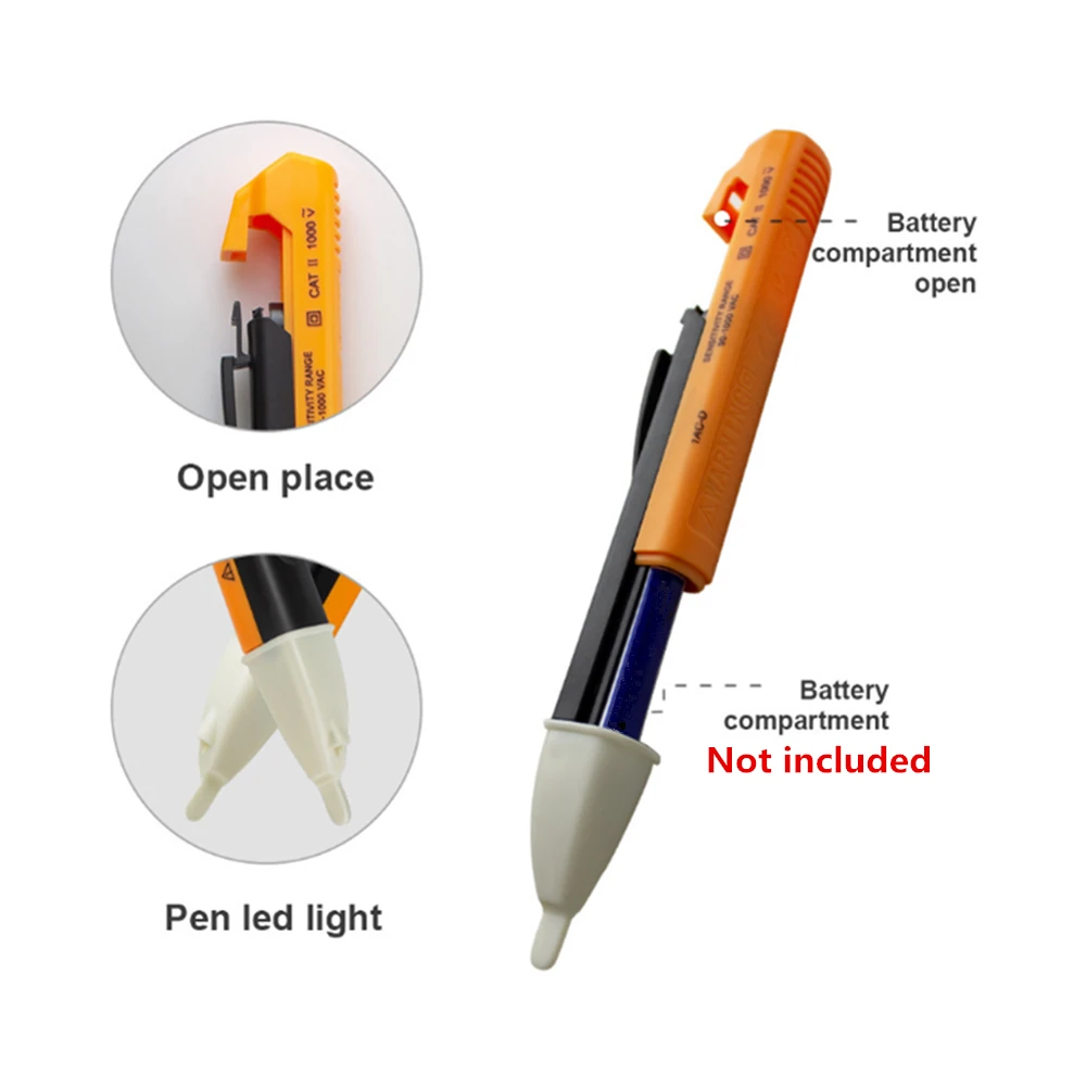 Электрическая розетка настенная AC мощность розетка тестер датчика детектора напряжения Ручка 90-1000 ВБесконтактные тестеры напряжения переменного тока следующего поколения просты в использовании-просто прикоснитесь к наконечнику к клеммной полосе, розетке или шнуру питания. Когда наконечник светится красным, и устройство загорится, вы знаете, что присутствует напряжение. Электрики, техническое обслуживание, обслуживание, персонал по безопасности и домовладельцы могут быстро проверить на напряженные цепи на рабочем месте или дома.Частотный диапазон: от 50 до 500 ГцДиапазон испытательного напряжения: 90-1000 В переменного токаСтепень безопасности: CAT II 1000vПитание: 2 батарейки ААА (не входит в комплект)Идеальный набор инструментов для домашнего и электрического использованияИдеальный дизайн для тестирования силовых кабелей, автоматических выключателей, настенных розеток, распределительных коробок, предохранителей и т. д.Просто нажмите кнопку, белый светодиодный светильник всегда может быть включен, когда нет напряжения"Звуковой сигнал" и красный мигающий светодиодный индикатор указывают на наличие напряженияПолностью изолированный, без открытого металла или проводящих частейДлительный срок службы и низкое энергопотреблениеКомпактный, безопасный и удобный для переноски