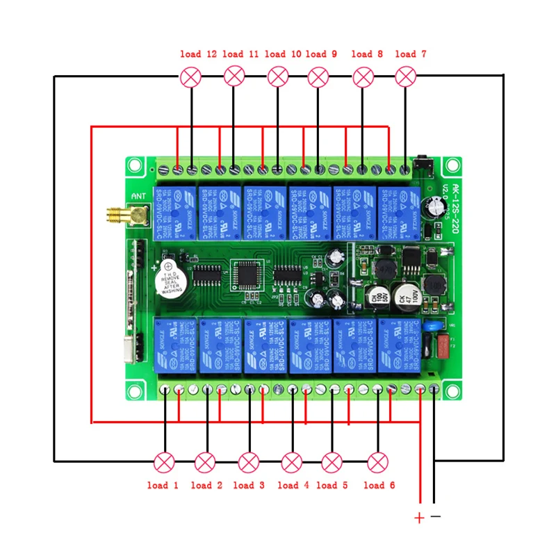 Переключатель --------------- нажмите кнопку передатчика 1 1 раз, реле приемника включится, нажмите кнопку 1 еще раз, реле приемника 1-е выключится, те же 2/3/4/5/6 --- 12 являются независимыми.