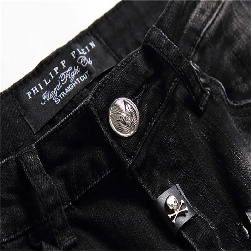 Мужские сезонные модные повседневные универсальные черные зауженные джинсы с принтом и дырками стрейч большого размера