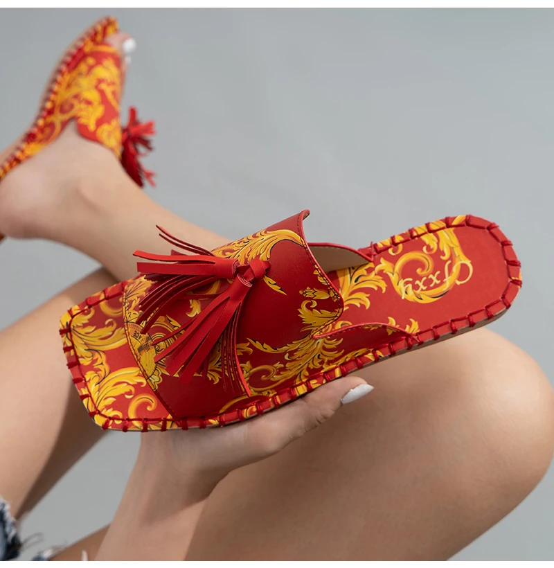 Женские семейные летние тапочки, женские ретро тапки с кисточками, квадратным носком, Женская Повседневная Удобная обувь на плоской подошве