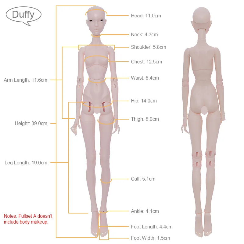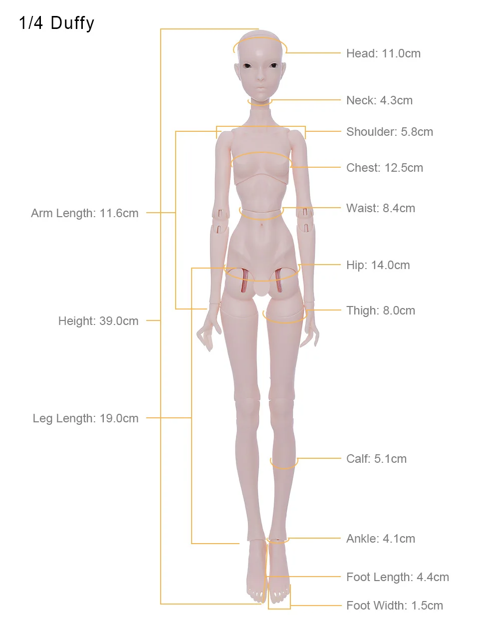 Высота: 39,0 смОкружность головы: 11,0 смОкружность шеи: 4,3 смШирина плеч: 5,8 смОбхват груди: 12,5 смОкружность талии: 8,4 смОбхват бедер: 14,0 смДлина руки: 11,6 смДлина штанины: 19,0 смОкружность бедра: 8,0 смОкружность икры: 5,1 смОкружность лодыжки: 4,1 смШирина стопы: 1,5 смДлина стопы: 4,4 смГлаза: 6 ммPS: из-за измерения вручную возможна погрешность в 1-3 см, надеемся на понимание!