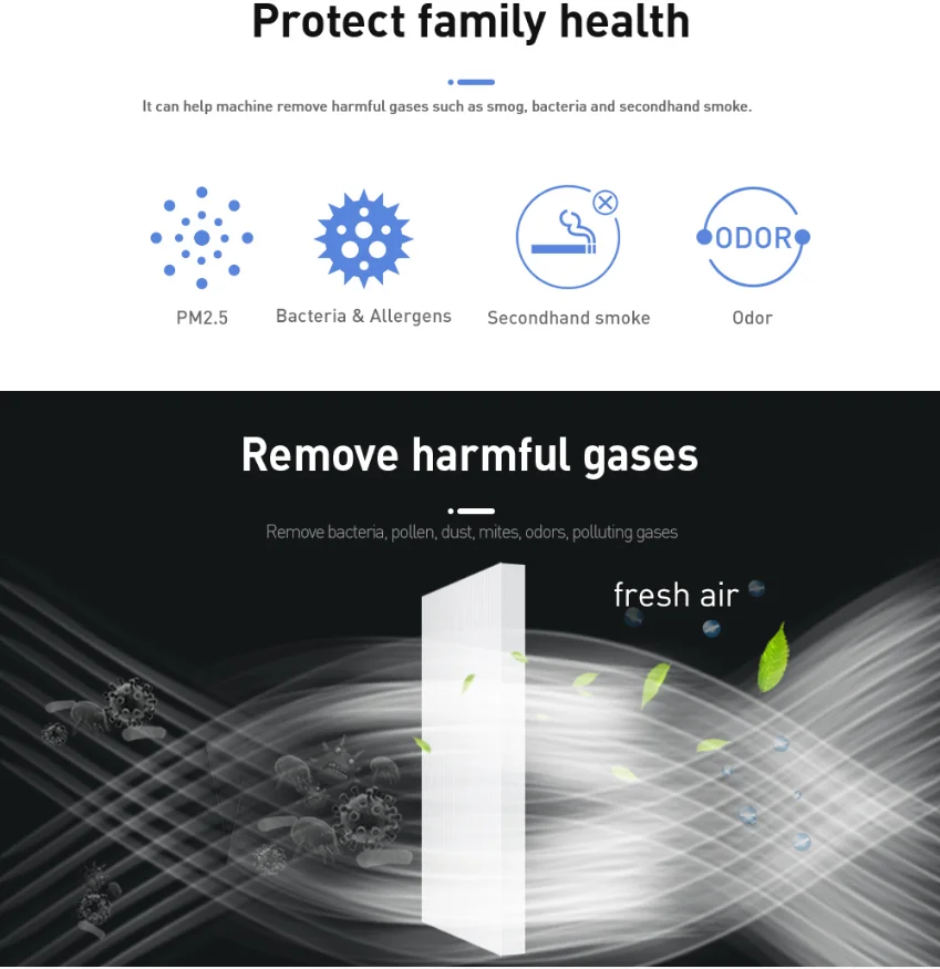 Высокая эффективность удаления таких частиц, как пыль, пыльца, PM2.5, амортизатор ПЭТ и вредный газ, как формальдегид, TVOC, боеприпасы и т. д.