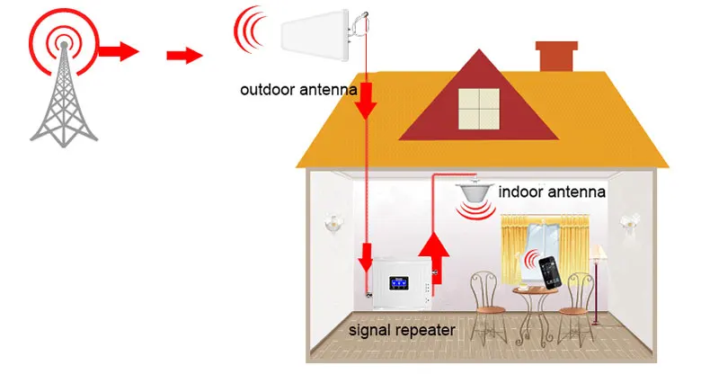 Наружная антенна захватит хороший наружный сигнал,↓Усилите его через усилитель сигнала,↓А затем передавайте его через внутреннюю антенну.↓В помещении может достичь хорошей среды сигнала.