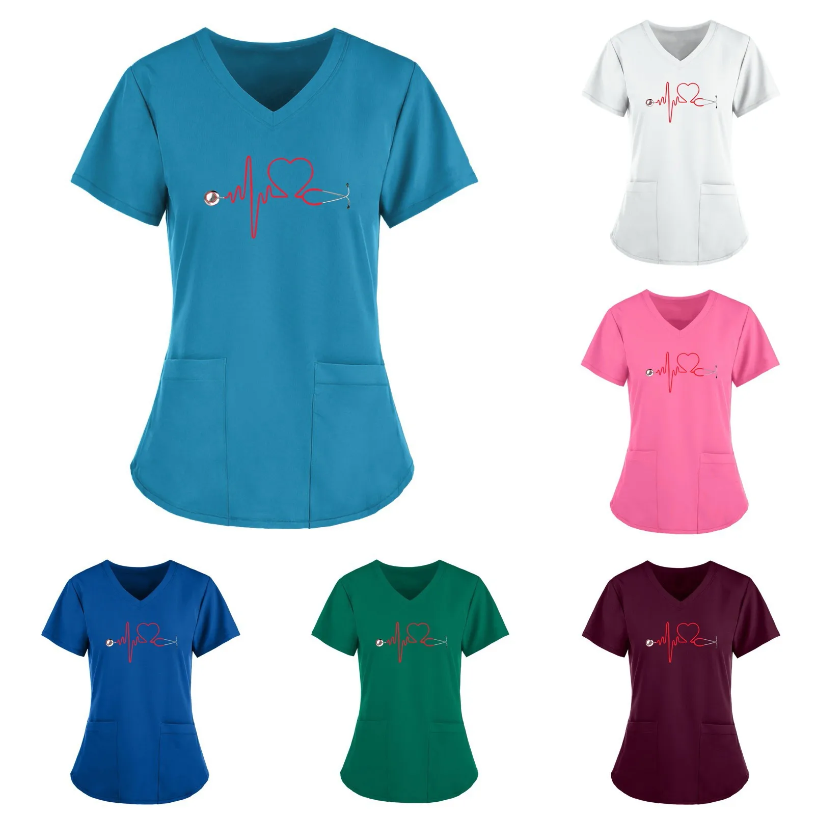 Женский топ с коротким рукавом и v-образным вырезом размера плюс, Рабочая форма с сердечком и карманом Ecg, униформа для медсестры, модель A50