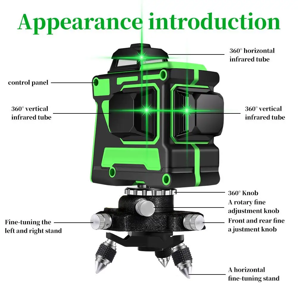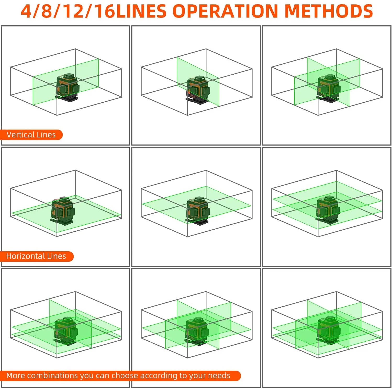 Самонивелирующийся зеленый лазерный уровень, 1216 линий, 3D4D, 360 градусов
