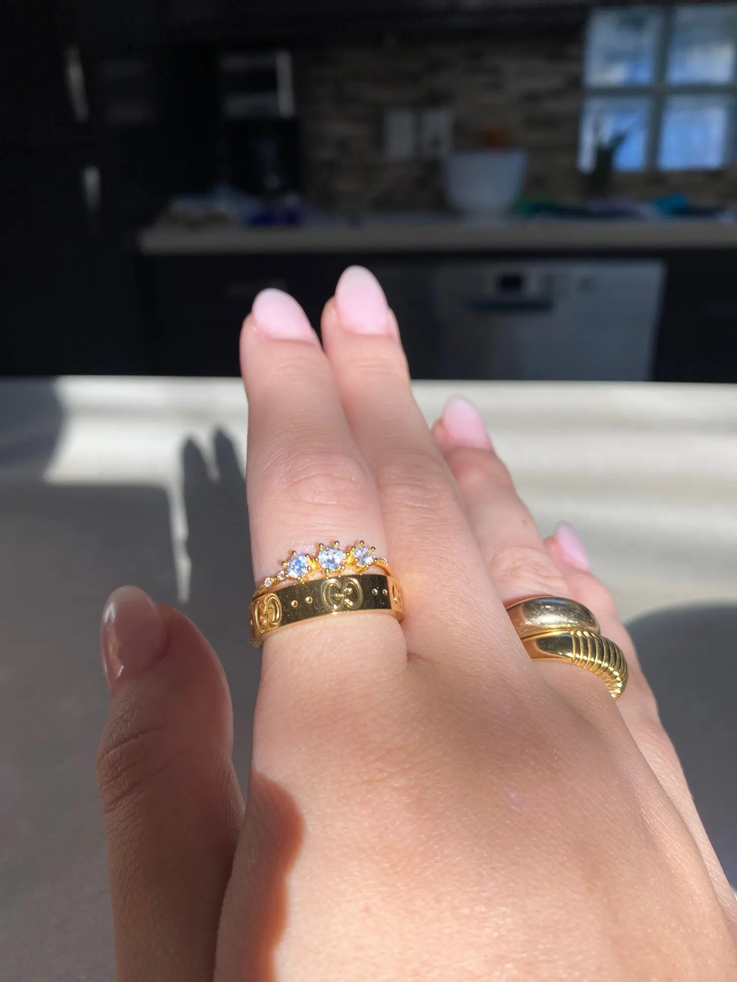Золотое кольцо с необычным горизонтальным овальным камнем выглядит красиво, но не так красиво, как я ожидал! Для меня CZ довольно тусклый, а лента более оранжевая, чем мне бы хотелось. Однако, я также получил кольцо Мелани Кейси, вдохновленное ее миниатюрным кольцом с бриллиантами, и оно великолепное, поэтому я хотел бы получить его вместо этого. Кольца прибыли в Канаду через 3 недели!
