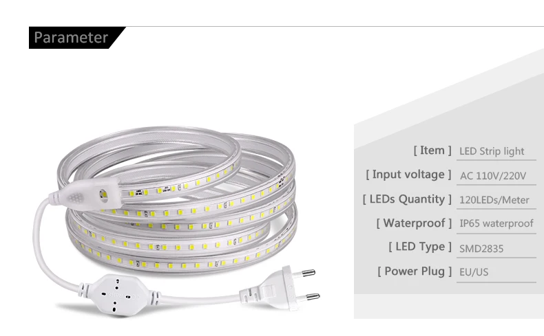 Цветовая температура: белый (6000K-6500K) ; Теплый белый (2800K-3500K)Светодиодный Тип: 2835SMDКоличество СВЕТОДИОДНЫЙ: 120 светодиодный S/метрСтепень водонепроницаемости: IP67 Водонепроницаемый (можно использовать на открытом воздухе)Рабочее напряжение: ac220в (с штепсельной вилкой европейского стандарта); Ac110в (с штепсельной вилкой американского стандарта)Срок службы: 50000 часовГарантия: 1 год