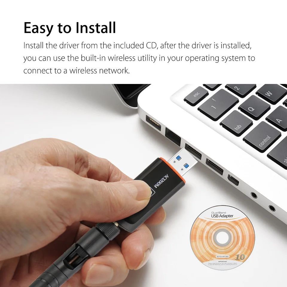 Особенности:1. Адаптер USB 3,0 обеспечивает более быстрый доступ в 10 раз, чем USB 2,0. Поддерживает Windows 7/ 8/ 10/XP 32/64 бит, для Linux и для Mac OS.2. Стандарт 802.11ac, новейшая и самая мощная беспроводная технология Wi-Fi, обратная совместимость с продуктом 802.11a/b/g/n.3. Повышает общую производительность до 1200 Мбит/с, скорость WiFi выше (866 Мбит/с) с диапазонами 802.11ac или (300 Мбит/с).4. С помощью беспроводного сетевого адаптера, вы можете обновить ваш ПК, ноутбук или Mac для работы с последним AC WiFi роутером.5. Двойной диапазон уменьшает помехи для лучшей беспроводной передачи. 5G Wi-Fi идеально подходит для игр и передачи hd-видео без задержек.6. Поддерживает шифрование WPA / WPA2/802.1X / WMM, что позволяет быстро достичь беспроводного шифрования, беспроводной сети.7. Сигнал приема и сигнал излученияХарактеристики:Чипсет: Realtek 8811AUЧастотный диапазон: 2,412-2,4835 ГГц; 5,180-5,320 ГГц; 5,500-5,700 ГГц; 5,745-5,825 ГГцРабочий канал: 1-14 (2,4G); 36-165 (5G)Стандарт: IEEE802.11b/g/n и 802.11acМаксимальная пропускная способность: 1200 Мбит/сБеспроводная скорость: До 866 Мбит/с (11ac); До 300 Мбит/с (11n)Антенна: 2 x внешняя антеннаИнтерфейс: USB3.0Посылка включает в себя:1 х беспроводной usb-адаптер1 x CD драйвер