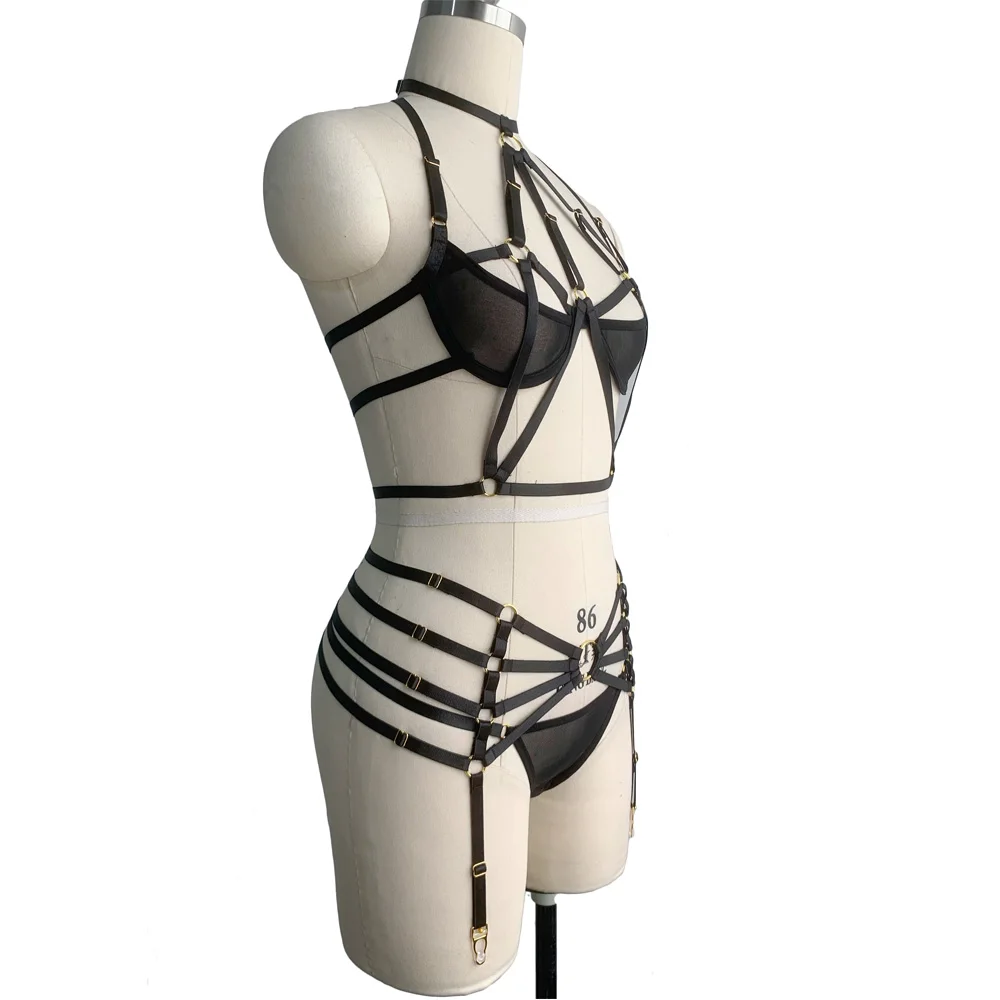 Комплект черная обвязка для тела, женский укороченный топ, сетчатый бюстгальтер-портупея, бандаж на ноги подвязки, пояс в стиле панк, полупрозрачные сетчатые стринги