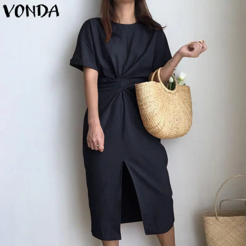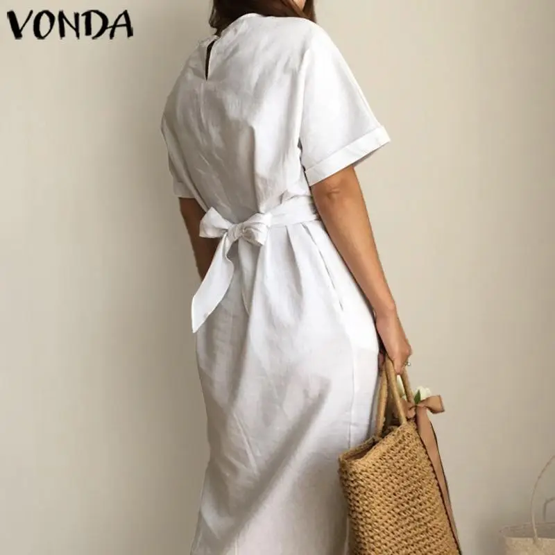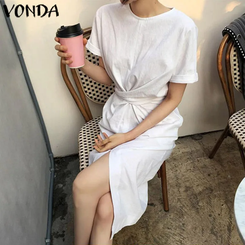 2022 VONDA женское Повседневное платье с коротким рукавом и разрезом спереди, платья с бантом, свободный хлопковый пляжный сарафан, женское вечернее платье