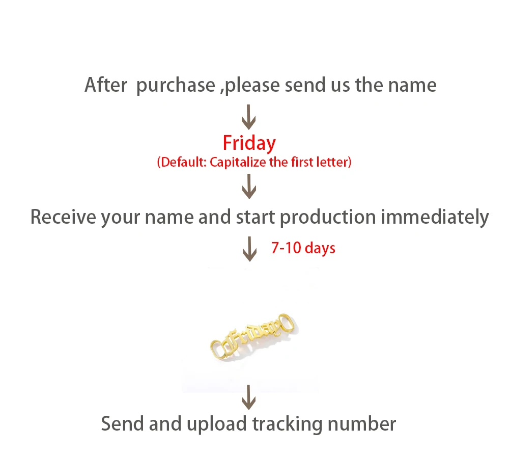 1. Пожалуйста, пришлите нам имя и шрифт, которые вы хотите заказать.2. Если вы не дадите нам имя и шрифт по индивидуальному заказу, мы свяжемся с вами. Если вы все еще не ответите через три дня, мы сделаем ожерелье в соответствии с именем вашего получателя и отправим его.3. Вы не можете отменить ваш заказ в течение 12 часов, потому что мы уже начали производство и надеемся получить ваше понимание4. У нас есть собственная Производственная фабрика, если вам нужна оптовая или Прямая поставка, пожалуйста, свяжитесь с нами.