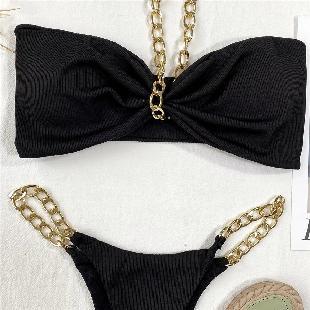 Купальник Vigorashely с цепочкой и лямкой на шее, женский сексуальный комплект бикини-бандо 2021, купальник со стрингами, черный купальный костюм с высоким вырезом, одежда для плавания