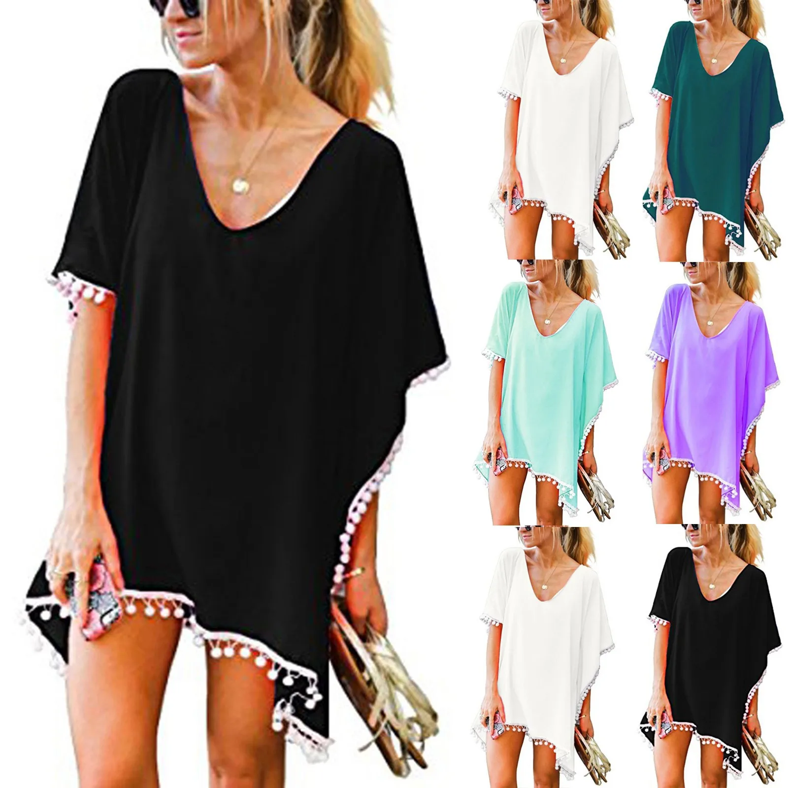 Женская шифоновая накидка на купальник, Пляжная накидка с кисточками, Летнее мини-платье, свободное однотонное парео, новинка 2021