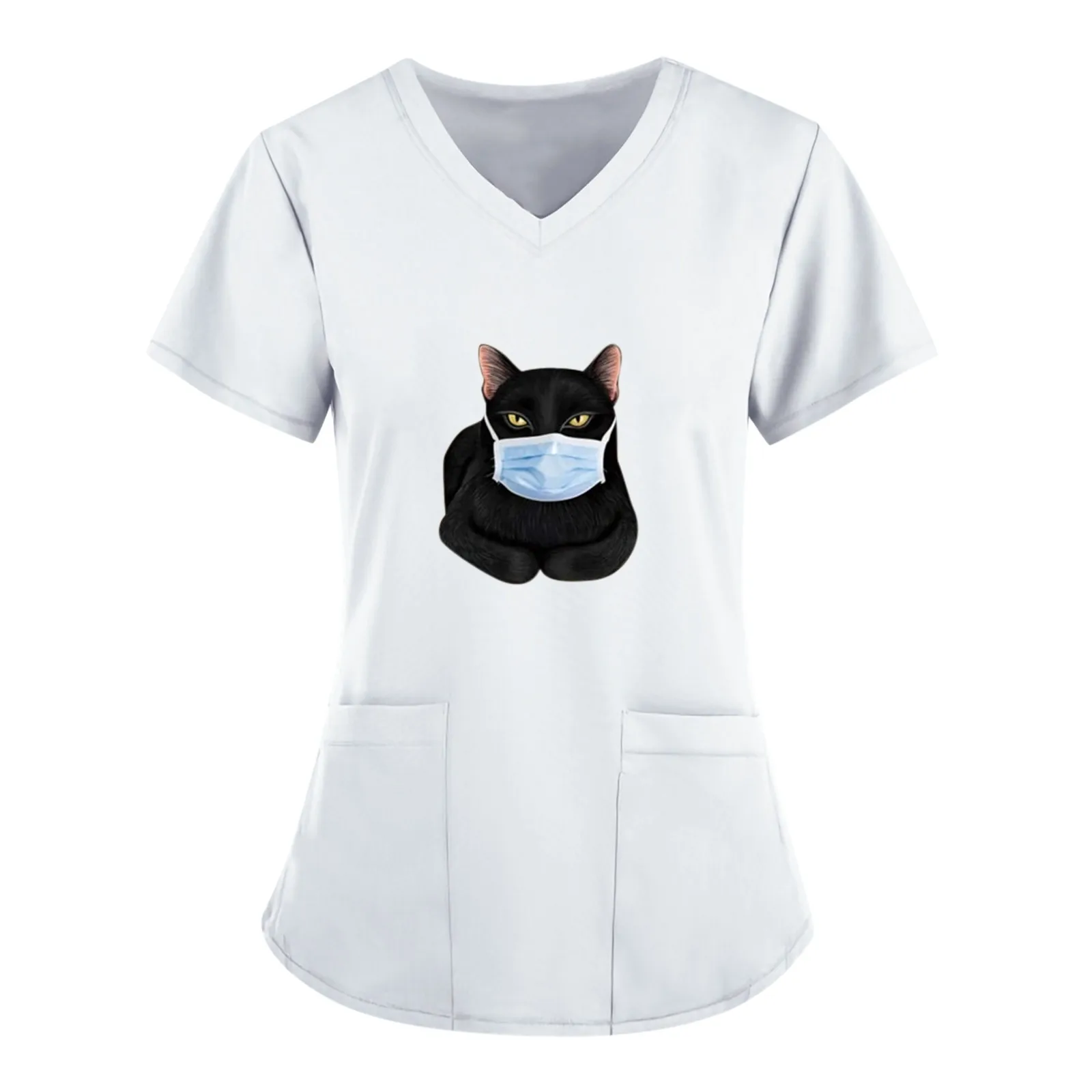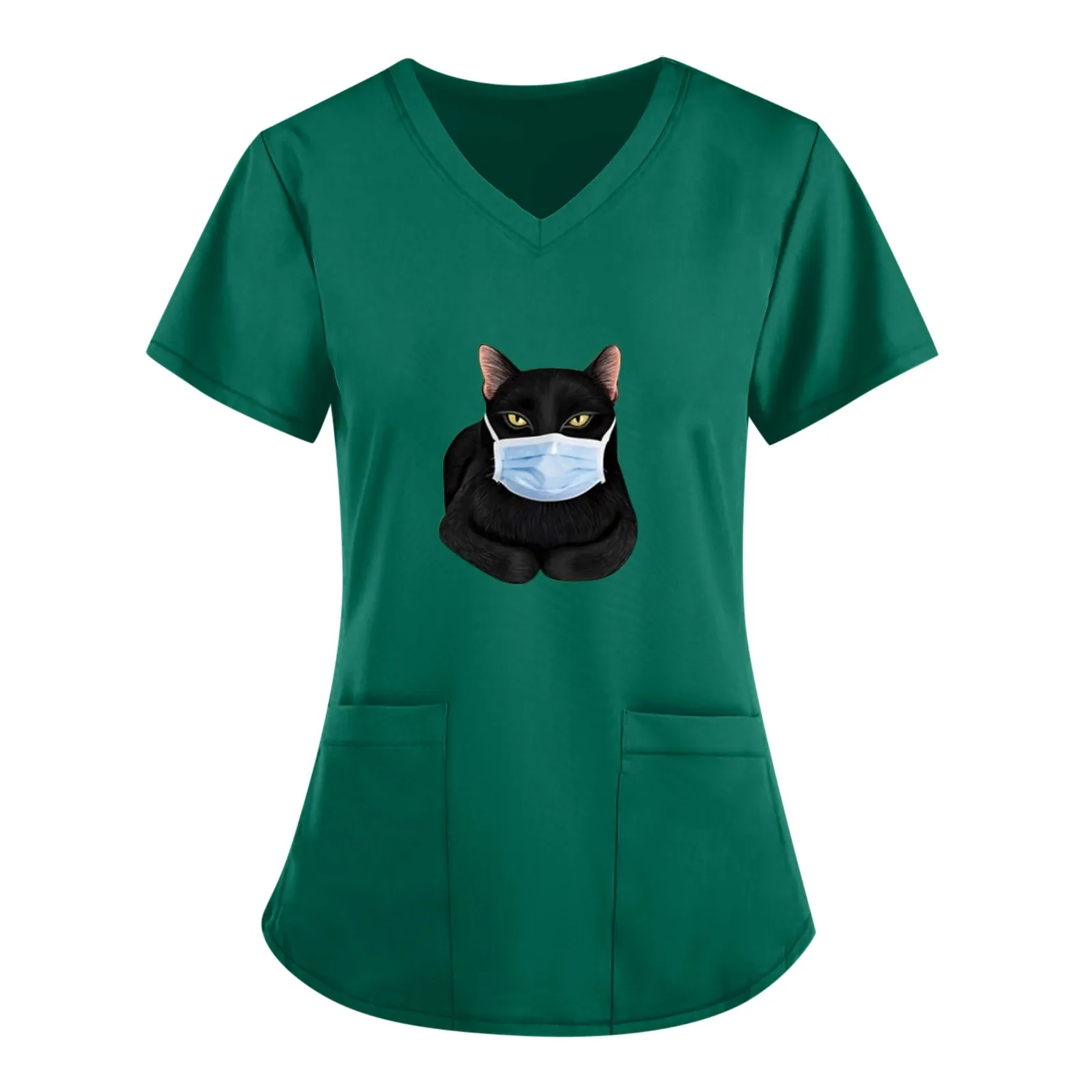 Женская футболка с коротким рукавом, с принтом черного кота, с V-образным вырезом и карманами