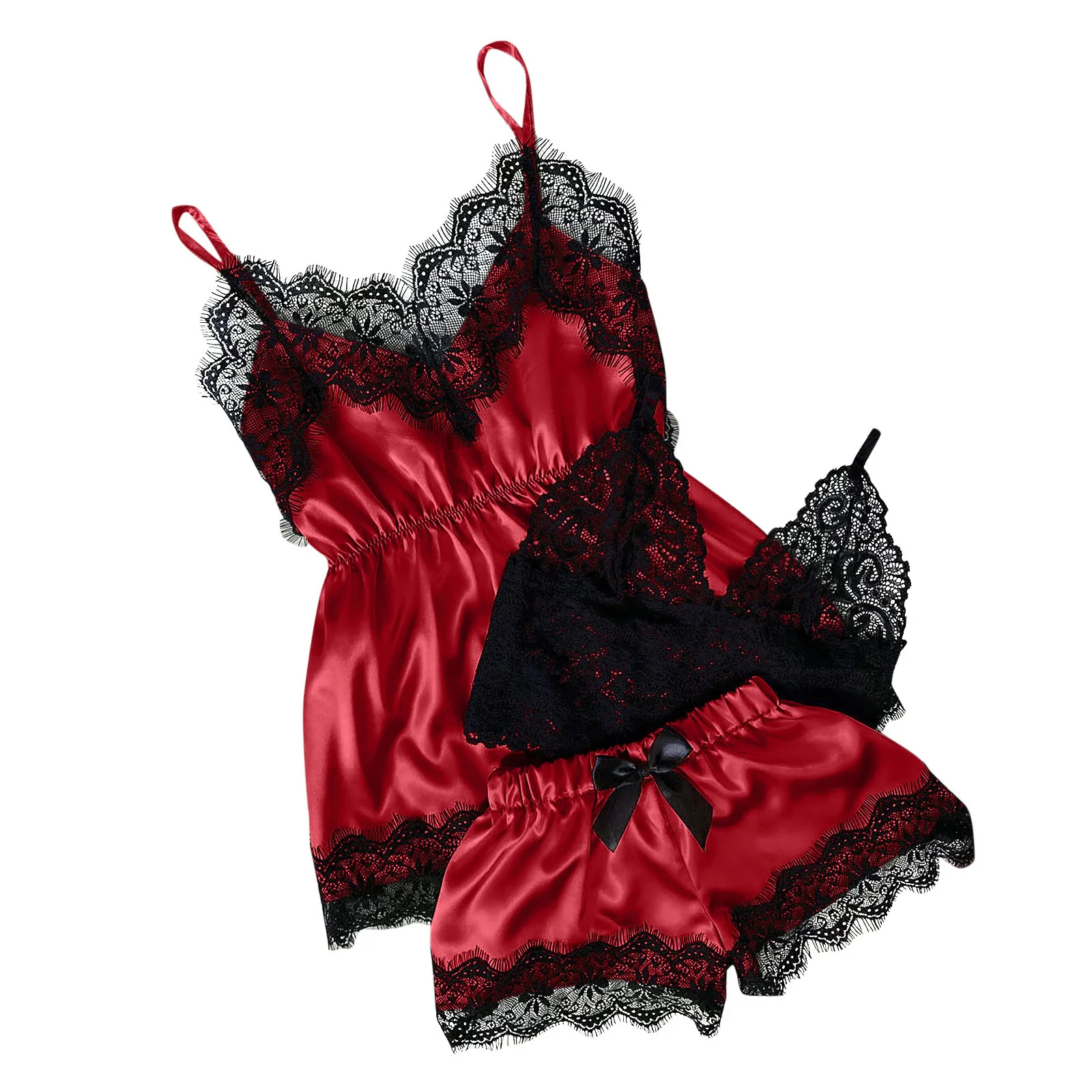 Пижама женская атласная, с V-образным вырезом и кружевом, красного ...