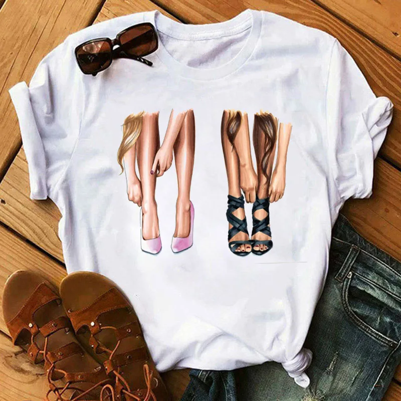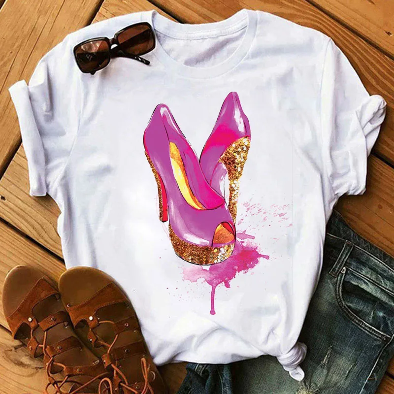 Модная женская футболка красная обувь на высоком каблуке футболка с губной помадой Женские топы с принтом Love What You Do Print 90-е женские черные футболки
