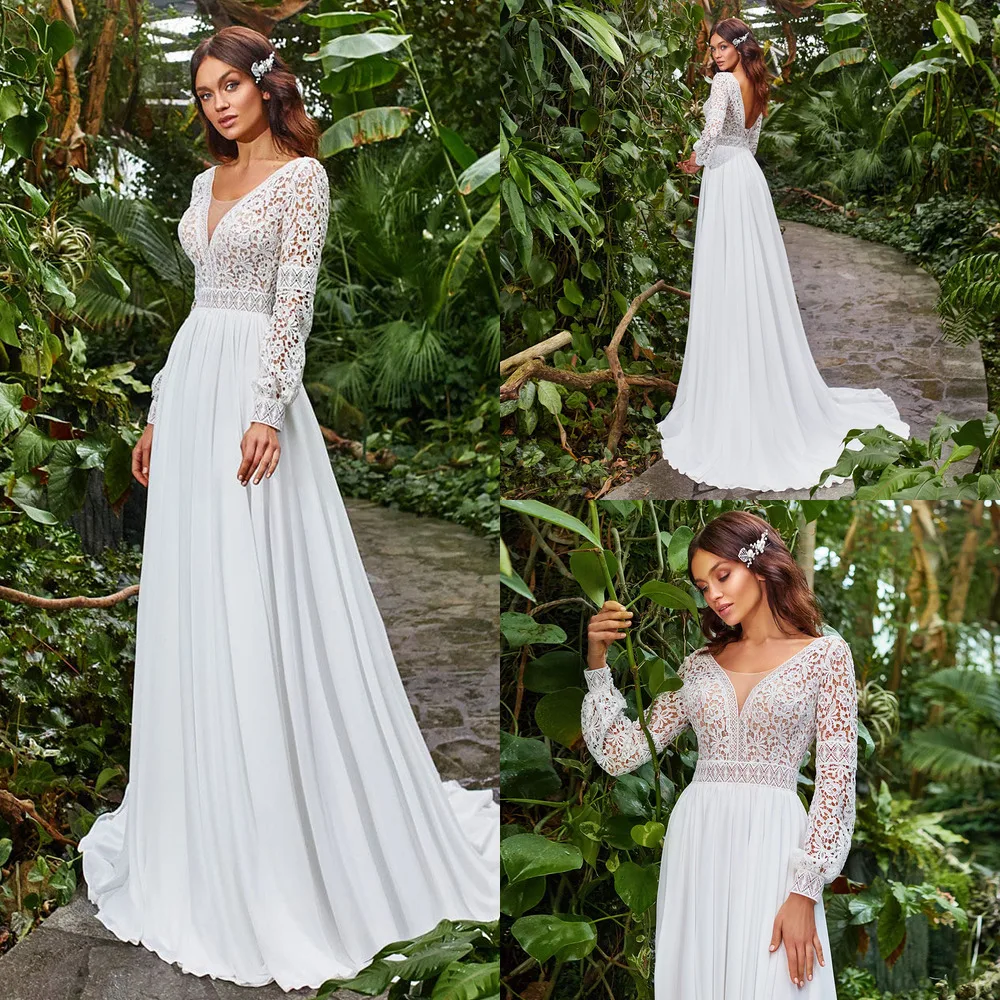 Шифоновое свадебное платье в стиле бохо, кружевное ТРАПЕЦИЕВИДНОЕ ПЛАТЬЕ со шлейфом и длинными рукавами, размера плюс, 2021