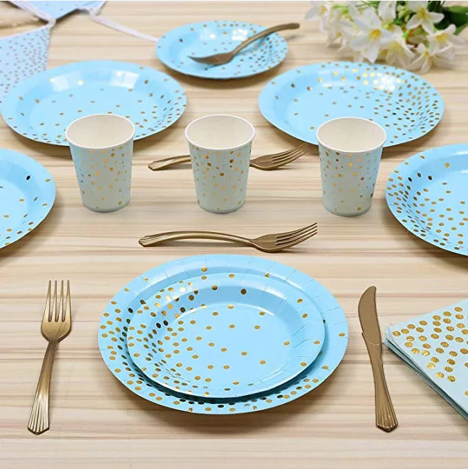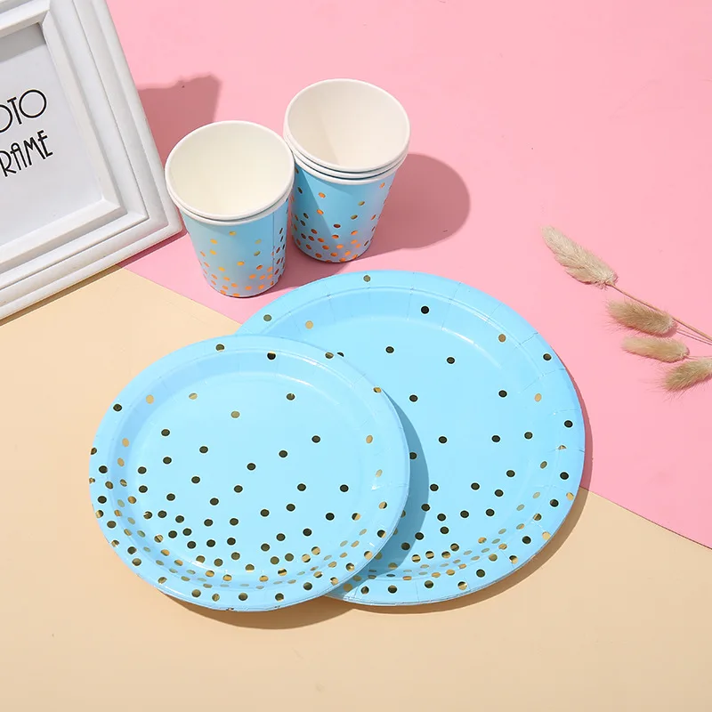 Бронзирующий синий набор посуды в горошек, бумажный стакан, товары вечерние, одноразовый набор посуды для дня рождения, товары для вечерние ринки, украшение