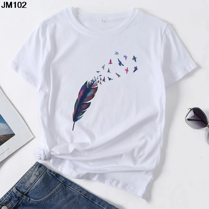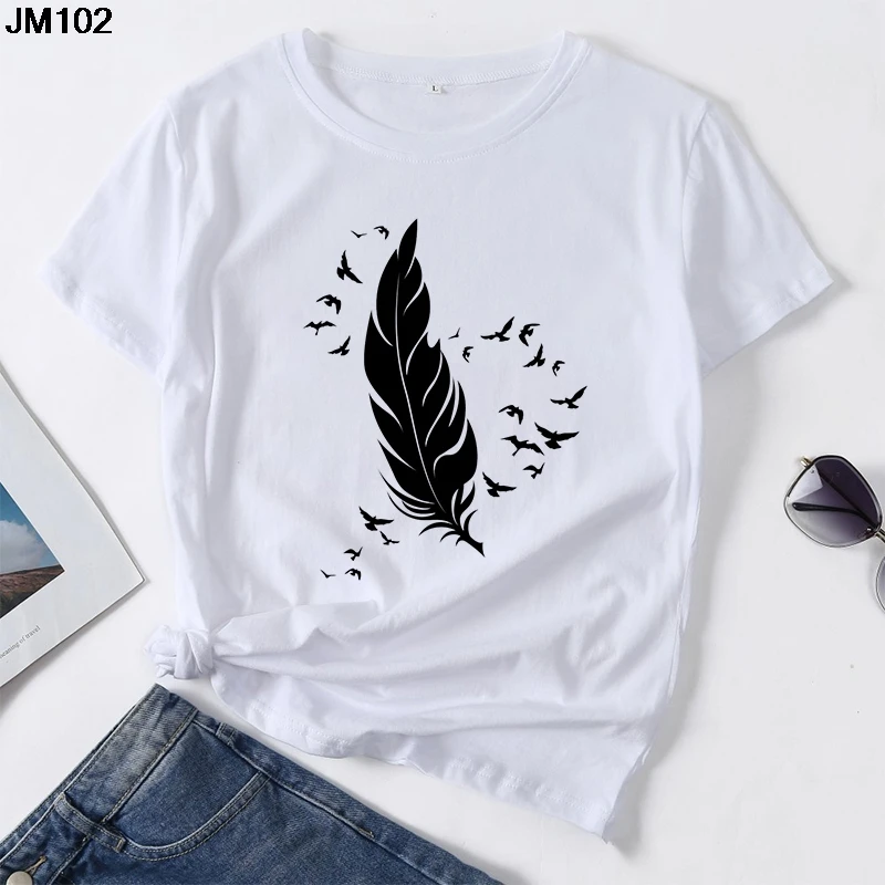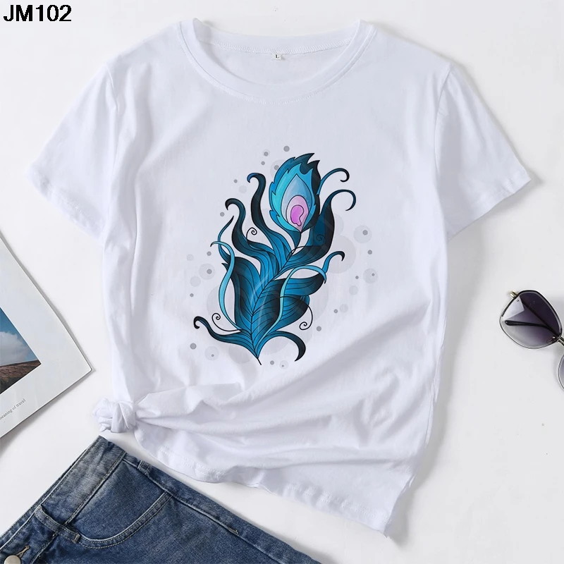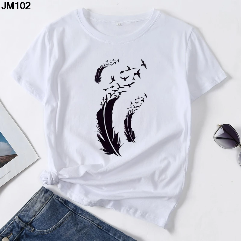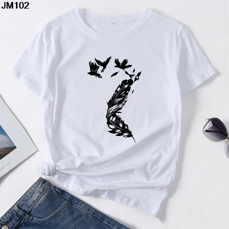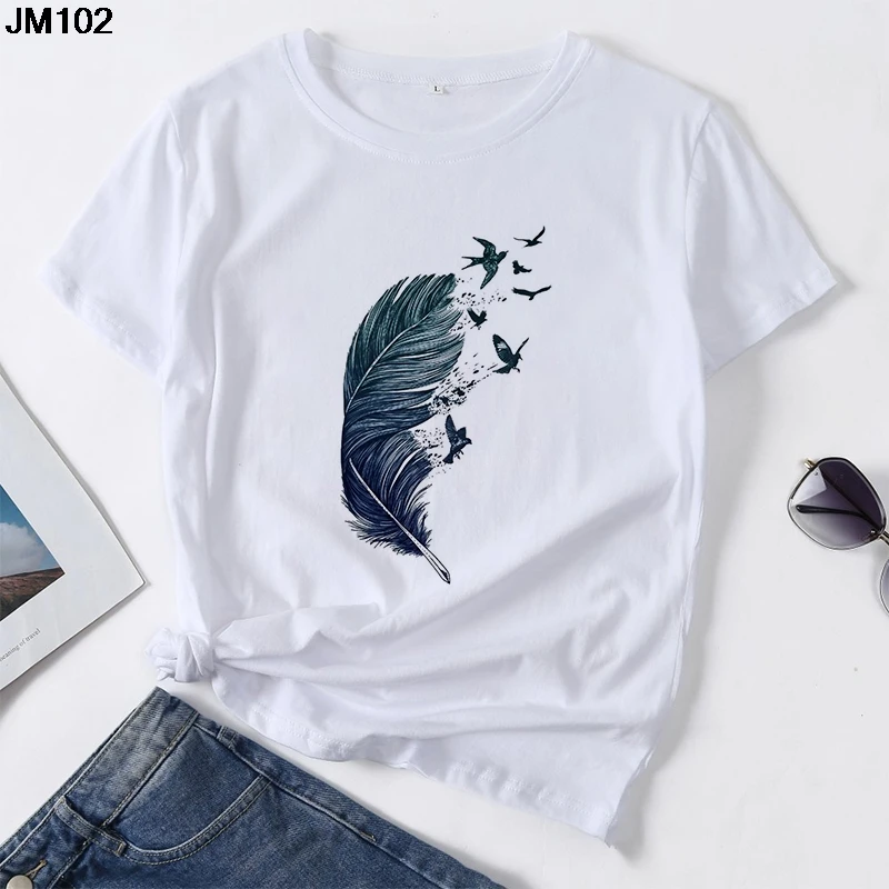 Футболка женская летняя с принтом птиц и перьев, повседневный топ с...