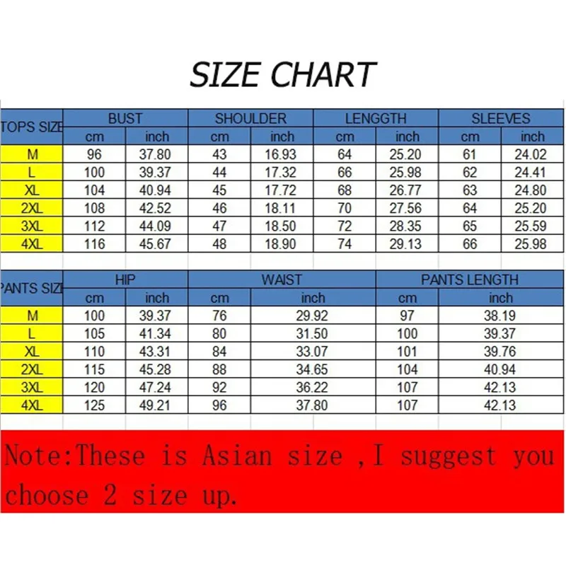 Таблица размеров толстовкиM: обхват груди: 96 см, длина: 64 см, длина рукава: 61 см, ширина плеч: 43 смL: обхват груди: 100 см Длина: 66 см Длина рукава: 62 см Ширина плеч: 44 смXL: обхват груди: 104 см, длина: 68 см, рукав: 63 см, ширина плеч: 45 см2XL: обхват груди: 108 см, длина: 70 см, рукав: 64 см, ширина плеч: 46 см3XL: обхват груди: 112 см, длина: 72 см, рукав: 65 см, ширина плеч: 47 см4XL: обхват груди: 116 см, длина: 74 см, рукав: 66 см, ширина плеч: 48 смТаблица размеров брюкM: Длина: 97 см обхват бедер: 100 см обхват талии: 76 смL: Длина: 100 см обхват бедер: 105 см обхват талии: 80 смXL: Длина: 101 см обхват бедер: 110 см обхват талии: 84 см2XL: Длина: 104 см обхват бедер: 115 см обхват талии: 88 см3XL: длина: 107 см обхват бедер: 120 см обхват талии: 92 см4XL: длина: 107 см обхват бедер: 125 см обхват талии: 96 см