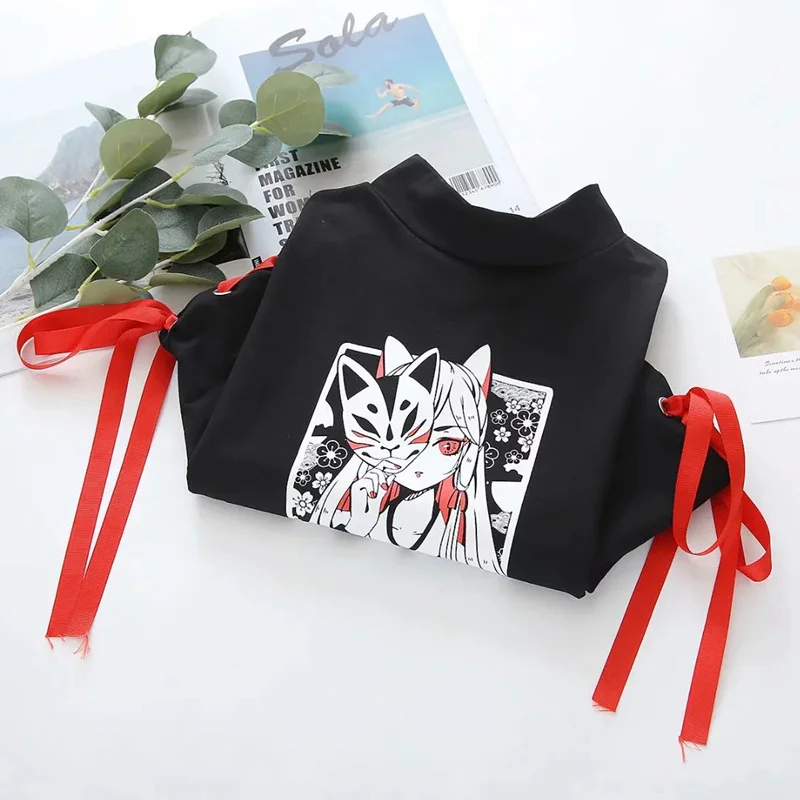 Футболка женская, с принтом аниме, лисы, ленты, с бантом, черная, для весны и лета, 2021