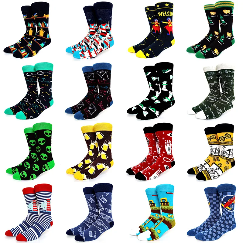 Носки мужские Смешные в стиле Харадзюку, Короткие хлопковые для езды на велосипеде, с символами химикатов, инопланетянами, шахматами, акулами