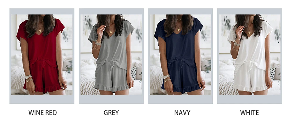 Комплект из двух предметов с оборками, женская одежда, свободная летняя Пижама, одежда для сна, модный однотонный Повседневный Топ с V-образным вырезом и шорты