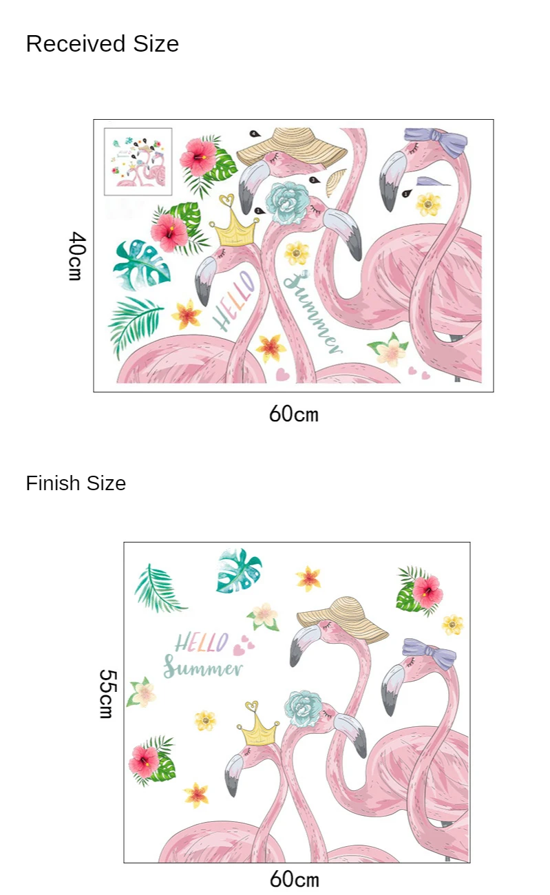 1. Эта Наклейка представляет собой Самоклеющуюся наклейку, ее можно просто снять и надеть на любое желаемое место. 2. Полученный размер: Фламинго 1: 60 см/23,62 дюйма * 40 см/15,75 дюйма Фламинго 2: 60 см/23,62 дюйма * 40 см/15,75 дюйма Фламинго 3: 4,6 см/5,75 дюйма * 21 см/8,27 дюйма (6 шт.) 3. Размер после наклеивания: Фламинго 1: 59,5 см/23,43 дюйма * 63 см/24,8 дюйма Фламинго 2: 60 см/23,62 дюйма * 55 см/21,65 дюйма Фламинго 3: каждый шт 5,01 см/1,97 дюйма * 7,69 см/3,03 дюйма (1 лист = 6 шт., всего 6 листов)