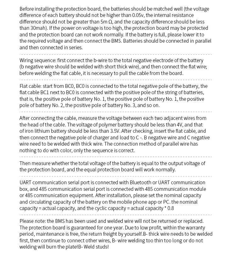 При сборке проводки, правильно приварите провод к аккумуляторной батарее, подключите B- of BMS к общему отрицательному электроду ячейки, А затем вставьте плоский кабель в штыревое сиденье на PCM. (Диффузные струны, диффузный способ. Пожалуйста, свяжитесь со службой поддержки клиентов для получения подробной информации)