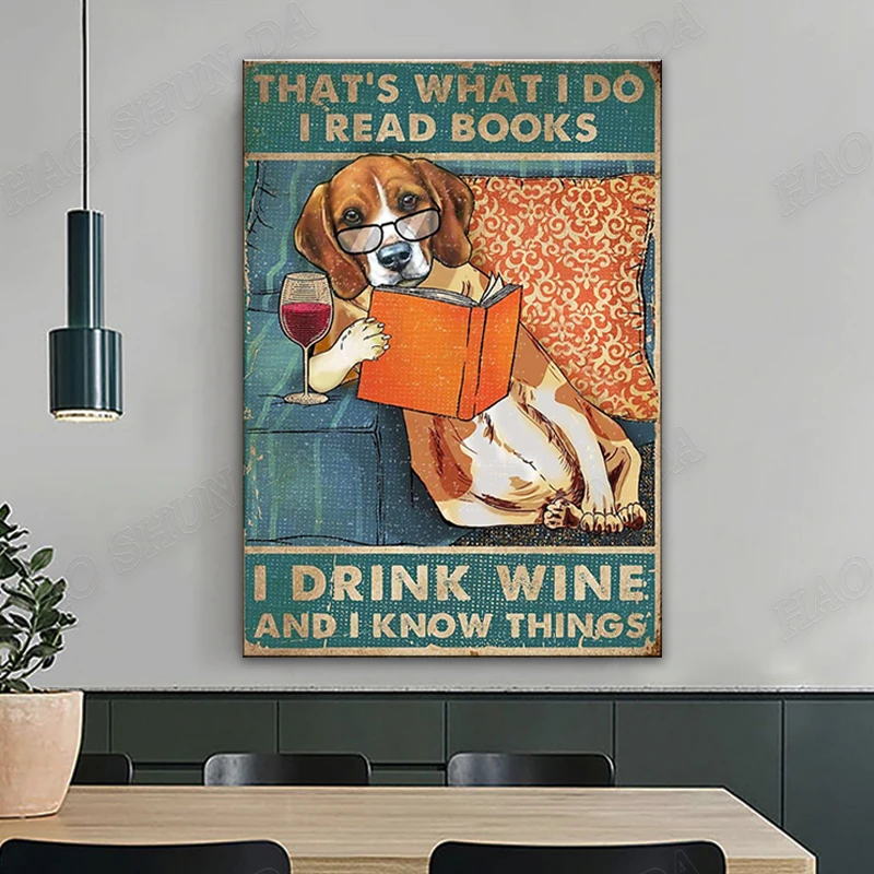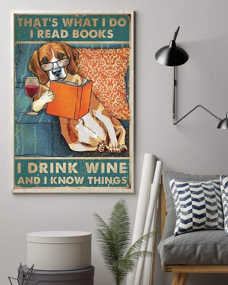 Funy Beagle плакат, я читаю книги, я пью вино, знаю вещи, настенное искусство, подвесное искусство, абстрактный акварель, домашний декор
