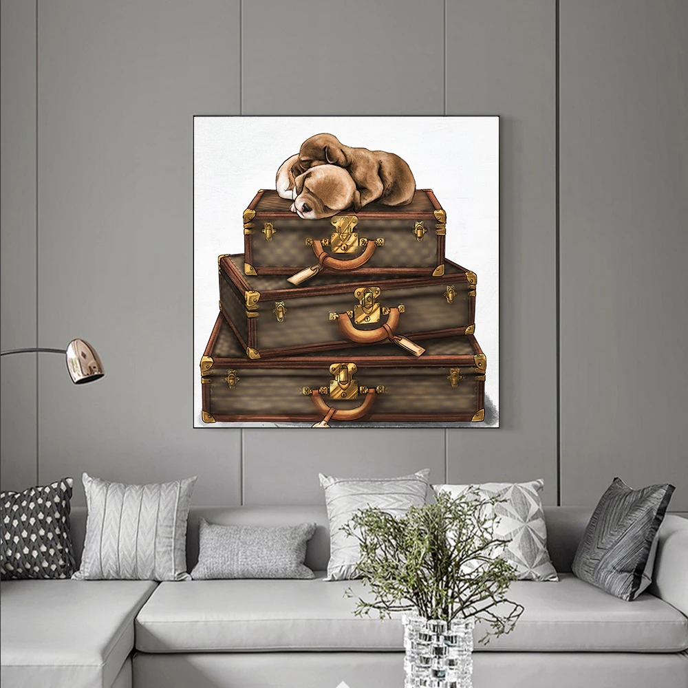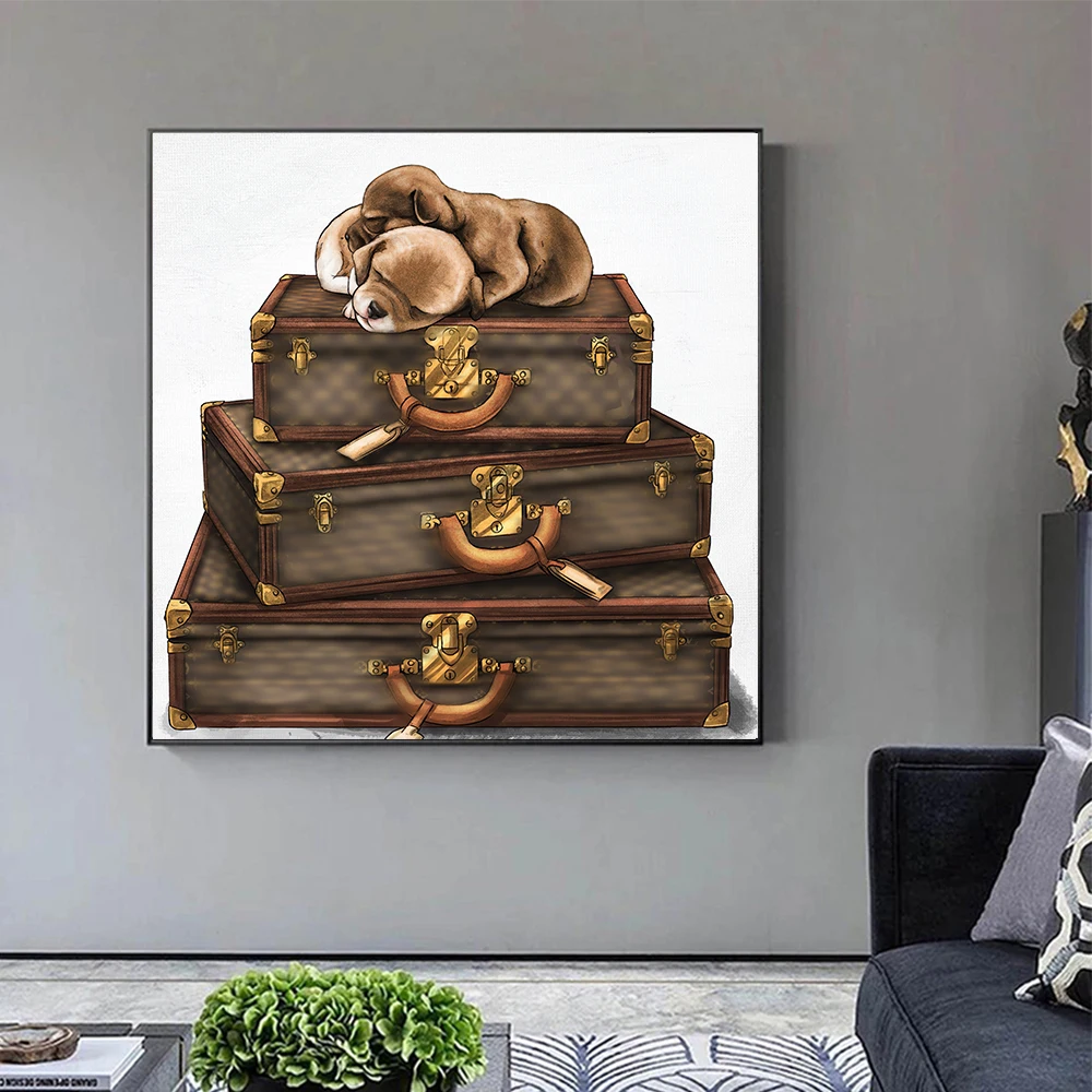 Простой винтажный роскошный холщовый постер в нордическом современном стиле с изображением собаки на благородном чемодане художественные картины для декора гостиной