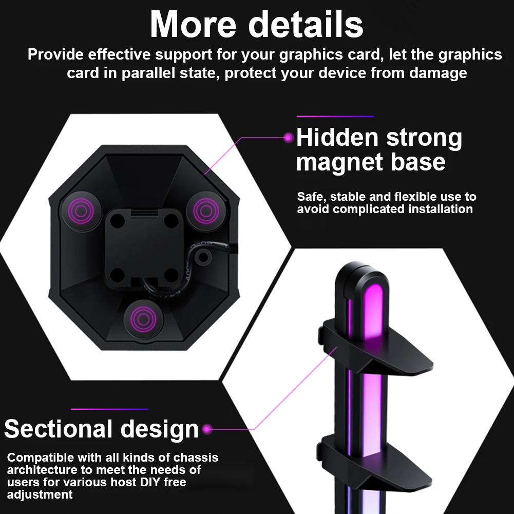 Описание: Скрытый Тип сильного магнитного основания, безопасное и стабильное, гибкое использование, Избегайте громоздкой установки Сегментированный дизайн, совместим со всеми видами архитектуры шасси, Для удовлетворения потребностей различных пользователей хоста, самостоятельная свободная регулировка Удобная конструкция пряжки, регулируемая высота кронштейна по желанию, удобная и быстрая, гибкая Материал ABS, высокая прочность, хорошая прочность, высокая термостойкость, Хорошая изоляция, не зависит от температуры, температуры и частоты Обеспечивает эффективную поддержку вашей видеокарты Так что видеокарта параллельно защищает ваше устройство от повреждений Различные световые эффекты могут быть синхронизированы с другими аппаратными огнями внутри корпуса, Поддержка синхронизации материнской платы Он может быть расширен для поддержки наушников, универсальный и гибкий для использования Сильное магнитное основание может гибко адсорбироваться на шасси для безопасного, стабильного и гибкого использования Характеристики: Тип: Графический держатель для карт Материал: АБС-пластик Цвет: черный Размер (Д * Ш): около 242x87x63мм Модель эффективности фотосъемки: ARGB Источник питания: 5 В Интерфейс: 5 В/3PIN интерфейс материнской платы поддерживает синхронизацию 5V светильник материнской платы) Посылка включает в себя: 1 шт. x Графический держатель для карт 2 шт. x Регулируемый угол поддержки 1 шт. x 3-контактный интерфейсный светильник Примечание: 1. В связи с использованием разных по светильник экране монитора фактический цвет товар точно такой же, как и цвет изделия на фото может быть s светильник ly отличается из-за характеристик монитора компьютера. 2. Замеры сделаны вручную, поэтому возможны 0,5-2 см, связанная с особенностями измерения вручную.
