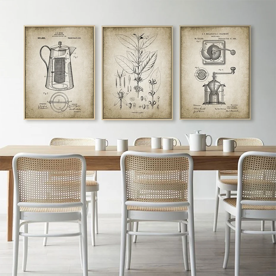 Винтажные патентованные постеры для кофемашины, холст, картина, искусство, настенная печать, картина для кафе, гостиной, интерьер, украшение для дома