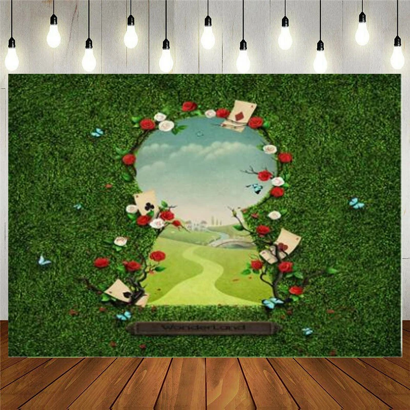 Фон для фотосъемки с изображением страны чудес, Сказочная сказка, зеленая трава, ворота, фон для фотосъемки для новорожденных, день рождения, торт, стол