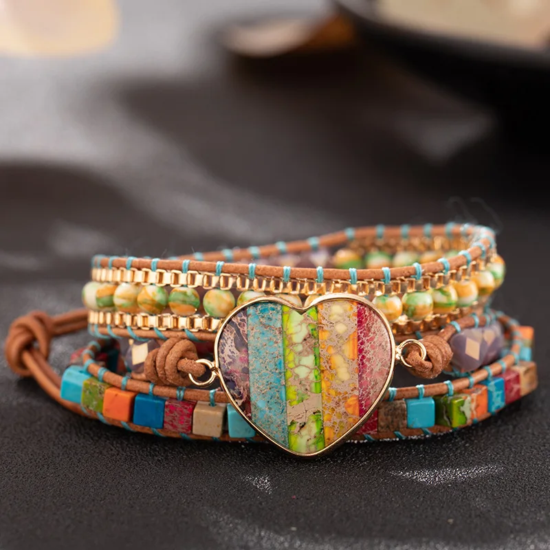 Новый Романтический духовного чакра кожаный браслет-обруч браслеты смешанные камень сердце Форма 3 пряди браслет классический ювелирные изделия влюбленных браслет