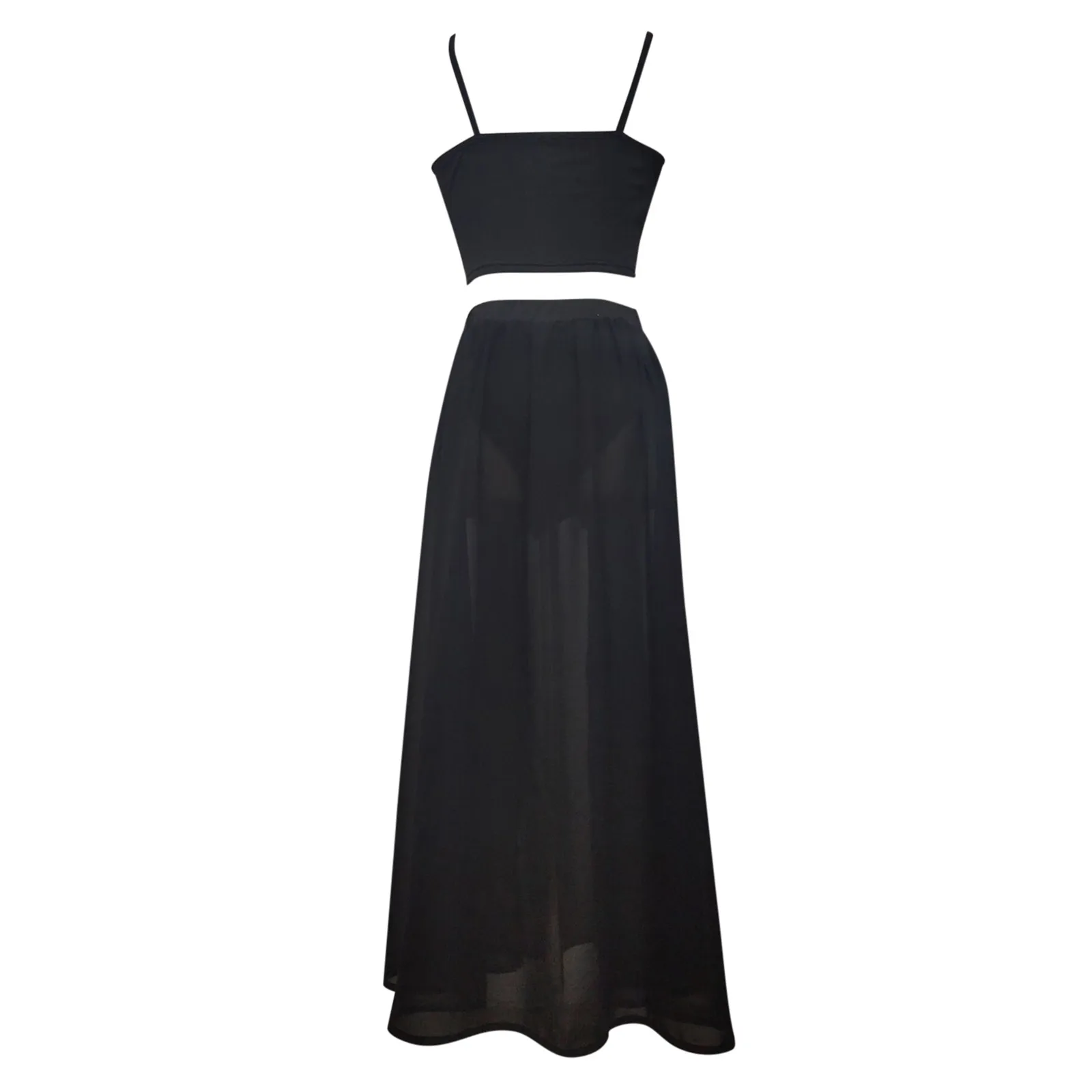Женское черное длинное платье комплекты сексуальные топы с открытыми плечами и Разделение юбочный костюм Для летних вечеринок комплект из двух предметов Vestidos De Mujer; Праздничное платье