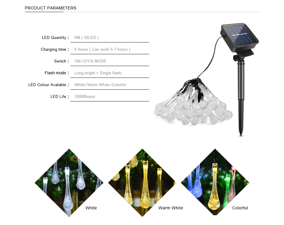 Особенности:1. Этот чудесный струнный светильник освещается ночью, идеально подходит для украшения вашего сада, патио, лужайки, крыльца, ворот, двора и т. д.2. Супер долгое время работы, он может непрерывно работать более 8 часов ночью, если панель поглощает достаточно солнечного света в течение дня.3. Водонепроницаемый, подходит для использования в помещении и на открытом воздухе.4. Панель на солнечных батареях стоит 20 см садовый шип. С включением/выключением, переключателями режимов.5. С 2 переключателями, один-режим (мигающий режим преобразования переключателя), другой-включение/выключение (после включения выключения, может автоматически управлять и заряжать светильник). Спецификация: 1. Тип: светодиодный светильник на солнечной батарее2. Светильник: белый/теплый белый/Разноцветный3. Аккумулятор: встроенный никель-металлогидридный аккумулятор4. Время зарядки: 6 часов5. Время работы: 6-10 часов.6. Режим светильник: устойчивая вспышка7. Батарея: 1,2 V 600MA8. Солнечная панель: 2 в 100 мА9. Срок службы: 15000 ч10. Метод управления: светильник.11. Длина: 6 м12. Кол-во: 30 светодиодов Светильник будет работать сам по себе, когда яркость окружающей среды составляет менее 30 люксОн может работать в течение 6-10 часов после полной зарядки в течение дняОн водонепроницаемый, вы можете положить его в дождь, но не помещайте его под водой Посылка включает в себя:1 x Панель солнечных батарей1x20 см шип1 x Гирлянда феи