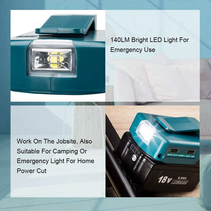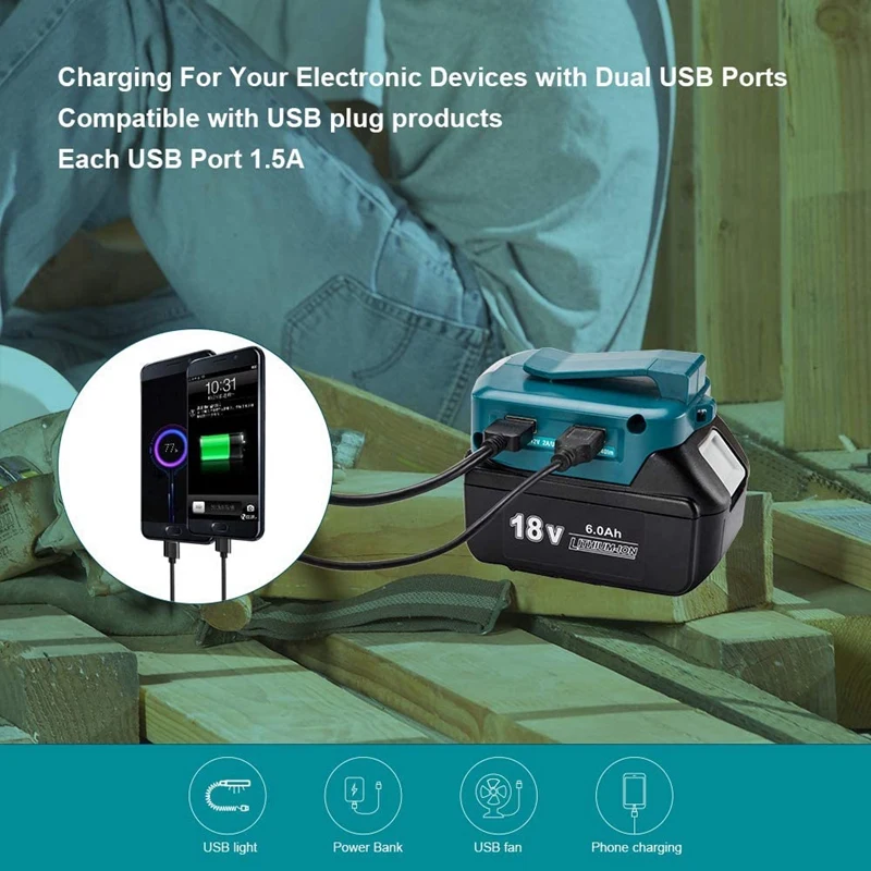 Рекомендации по использованию: при использовании usb-порта для зарядки мобильного устройства сначала Подключите кабель передачи данных к адаптеру USB, а затем подключите его к мобильному устройству. 100% совместим с литий-ионными аккумуляторами Makita 14,4 v ~ 18v LXT BL1415 BL1430 BL1440 BL1435 BL1445 BL1450 BL1830 BL1840 BL1850 BL1860 BL1815 BL1845.Яркий светодиодный светильник: помогает клиентам обеспечить светильник в темной среде или когда электричество выключается неожиданно. Не только как светильник на рабочем месте, но также может использоваться как флэш-светильник s, аварийный светильник s для домашнего отключения питания.Два usb-порта для зарядки, обеспечивающие быструю и легкую зарядку, могут заряжать два электрических устройства, таких как мобильные телефоны, цифровые аудио отклонения, планшетный ПК, usb-вентиляторы, цифровые камеры и маленькие электронные устройства.Низкое энергопотребление, защита от короткого замыкания/перегрузки по току/низкого напряжения.Небольшой размер и светильник вес. Источники питания постоянного тока в постоянный преобразователи супер светильник для того, чтобы носить его в кармане.Цвет: зеленыйМатериал: пластикРазмер: 11,0 см x 8,0 см x 5,0 смПосылка:1 х адаптерТолько вышеуказанная посылка, другие товары не включены.Примечание: светильник и различные дисплеи могут привести к тому, что цвет товара на картинке немного отличается от реального. Допускается погрешность в измерениях +/- 1-3 см.
