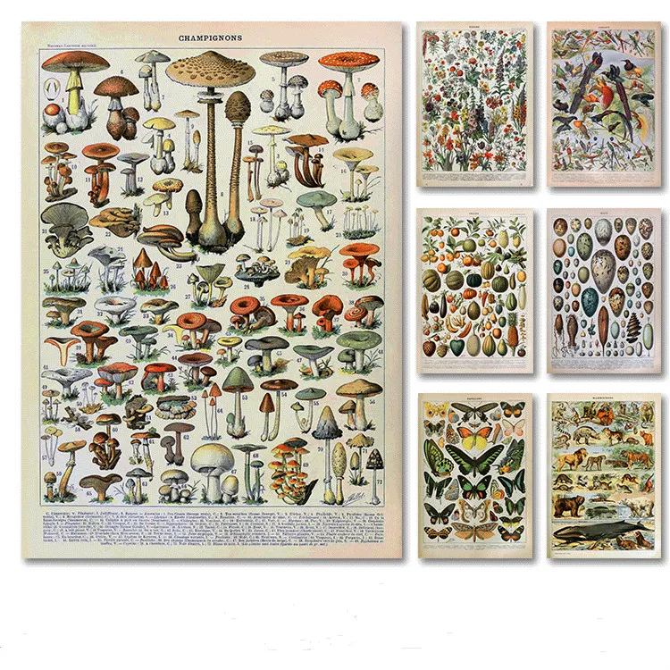 Винтажная Картина на холсте, растения, животные, грибы, Ретро плака...