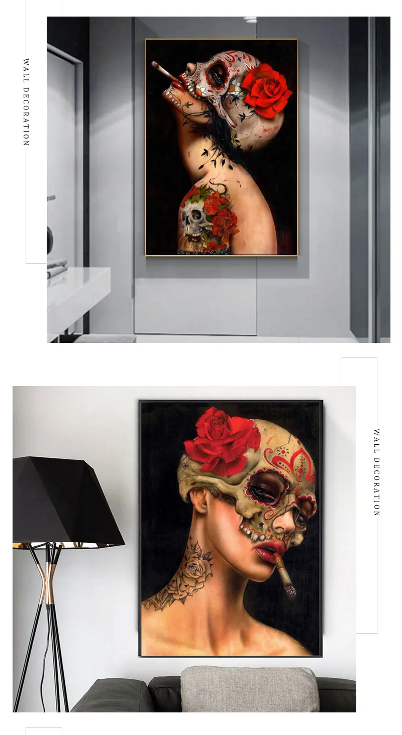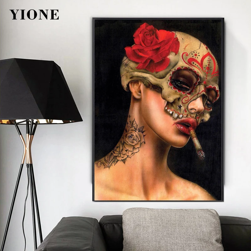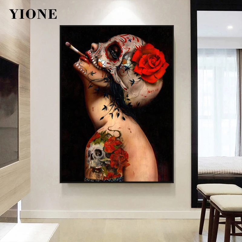 Плакаты на холсте с изображением девушки, курящей, темных цветов, черепа, скелета, граффити, картины для декора гостиной, спальни