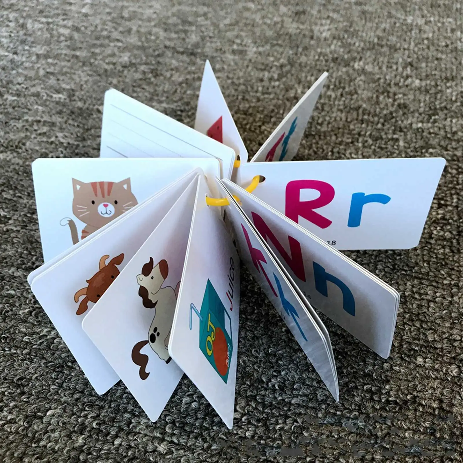 1. Двухсторонние карточки: толстый и прочный картонный материал, ламинированный с обеих сторон. Односторонняя печать букв ABC: 26 прописных букв и 26 строчных букв. Другая сторона печатается с фотографиями и текстами соответствующих элементов.