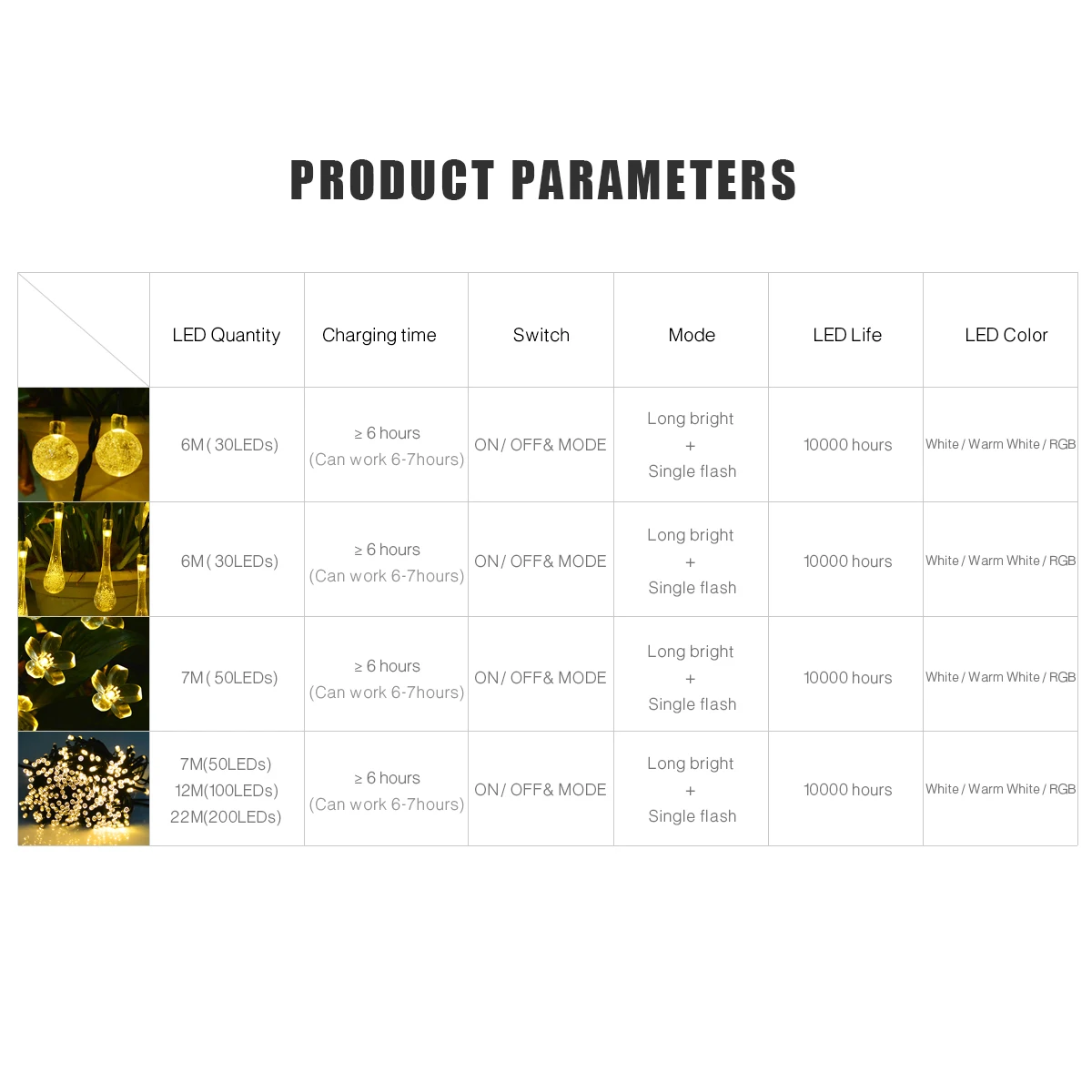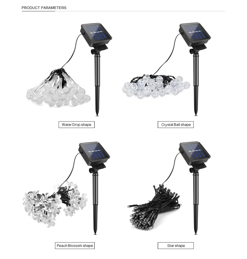1. Тип: Сказочный светодиодный светильник2. Светильник: белый/теплый белый/Разноцветный3. Аккумулятор: встроенный никель-металлогидридный аккумулятор4. Время зарядки: 6 часов5. Время работы: 6-10 часов.6. Режим светильник: устойчивая вспышка7. Батарея: 1,2 V 600MA8. Солнечная панель: 2 в 100 мА9. Срок службы: 10000 ч10. Метод управления: светильник. Светильник будет работать сам по себе, когда яркость окружающей среды составляет менее 30 люксОн может работать в течение 6-10 часов после полной зарядки в течение дняОн водонепроницаемый, вы можете положить его в дождь, но не помещайте его под водой