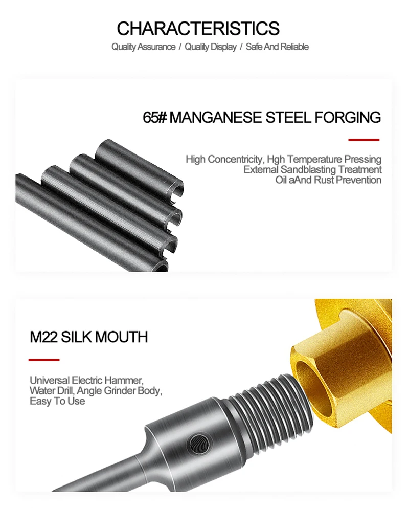 Особенности: 1,65 Высокая ковка марганцевой стали 2. Бесшовное соединение 3. Высокая концентричность 4. M22 адаптер сверла 5. Высокая прочность 6. Различные спецификации Спецификация: Цвет: серебристый Размер: различные спецификации Адаптационная машина: Стразы, электрический молоток, стержень для преобразования