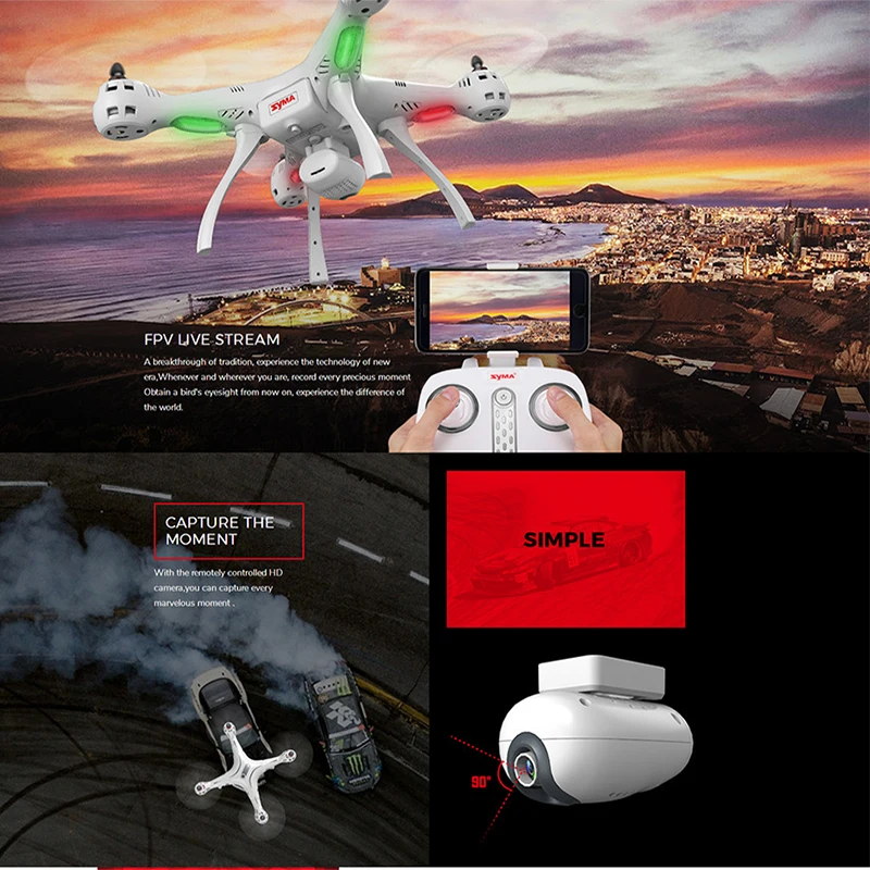 Описание:Номер товара. : X8 proЦвет: белыйЧастота: 2,4GКанал: 4CHГироскоп: 6 осейHD камера: фото/видео (720P) или камера 4KАккумулятор для квадрокоптера: 7,4 в 2000 мАч Li-poly (входит в комплект)Передатчик Батарея: 4x1,5 V AA Батарея (не входит в комплект)Время полета: около 12 минутВремя зарядки: около 150 минутРасстояние управления: около 100 метровРазмер изделия: 50*50*19 см Особенности:WIFI FPV с камерой 720P HD.С высоким режимом удержания можно установить высоту.Летательные аппараты, летающие в помещении и на открытом воздухе, могут быть с GPS точкой и высоким возвратом/давлением/геомагнитными без первоклассной специальной функции; поворот вверх/вниз/вперед/назад/около/вокруг стороны fly/полномасштабная операция общие функции, такие как кнопка взлета/посадкиПосылка:1 * Квадрокоптер Syma X8 PRO1*720P WIFI камера или 4K камера (опционально)1 * пульт дистанционного управления1 * держатель для телефона1*7,4 V 2000mAh аккумулятор8 * Пропеллер4 * крышка пропеллера4 * защитное кольцо4 * шасси1 * кард-ридер1 * зарядное устройство1 * отвертка1 * гаечный ключ1 * Руководство пользователя на английском языке1 * коробка из пенопласта