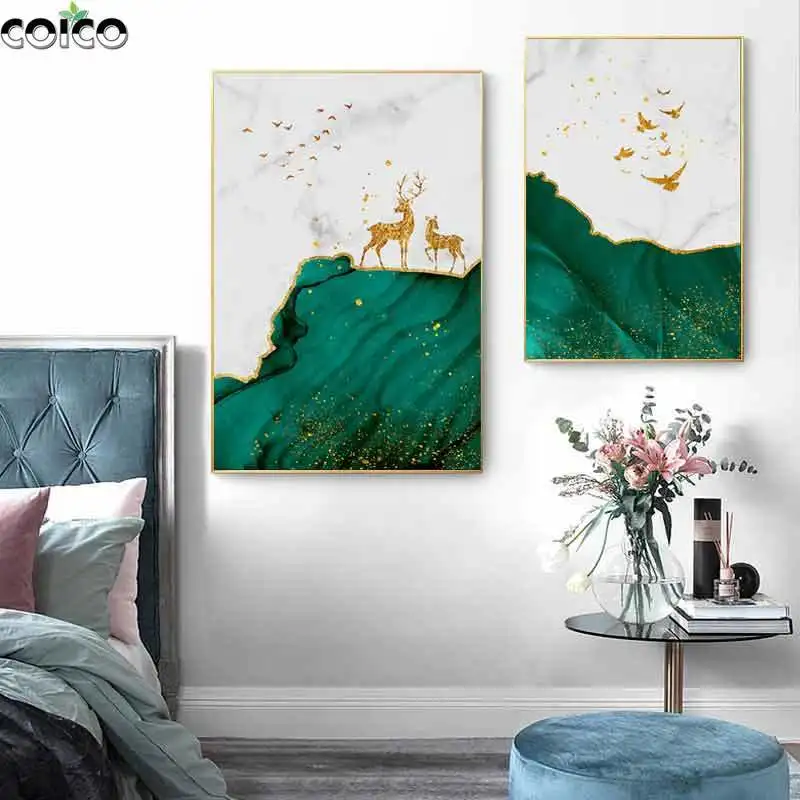 Абстрактная мраморная зеленая белая потоковая Золотая стена домашний Декор Картина на холсте олень дикая Гусь Картина декор для комнаты Плакат рамка
