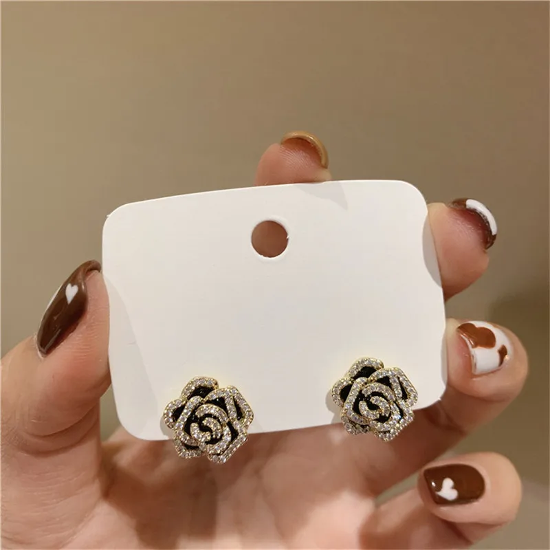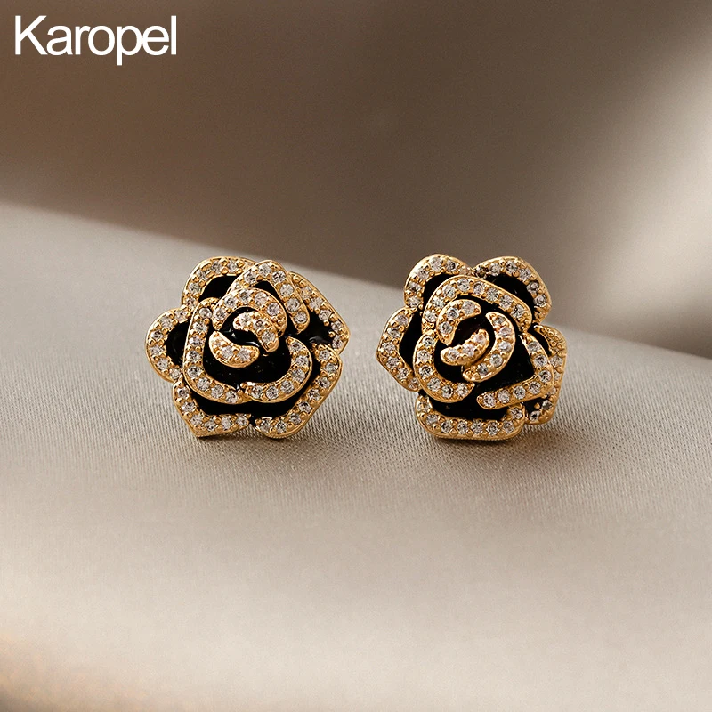 Женские серьги-гвоздики Karopel, классические элегантные серьги черного цвета с цветком камелии, корейские изысканные ювелирные изделия, модные аксессуары для девушек
