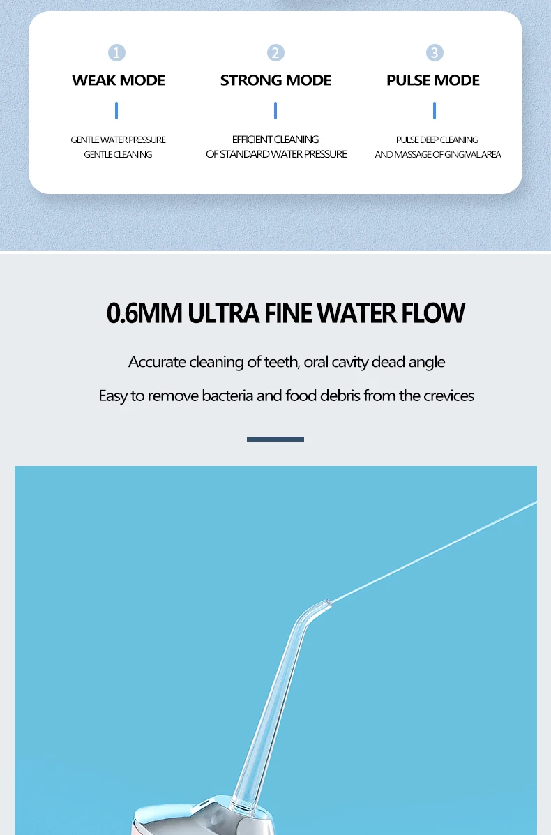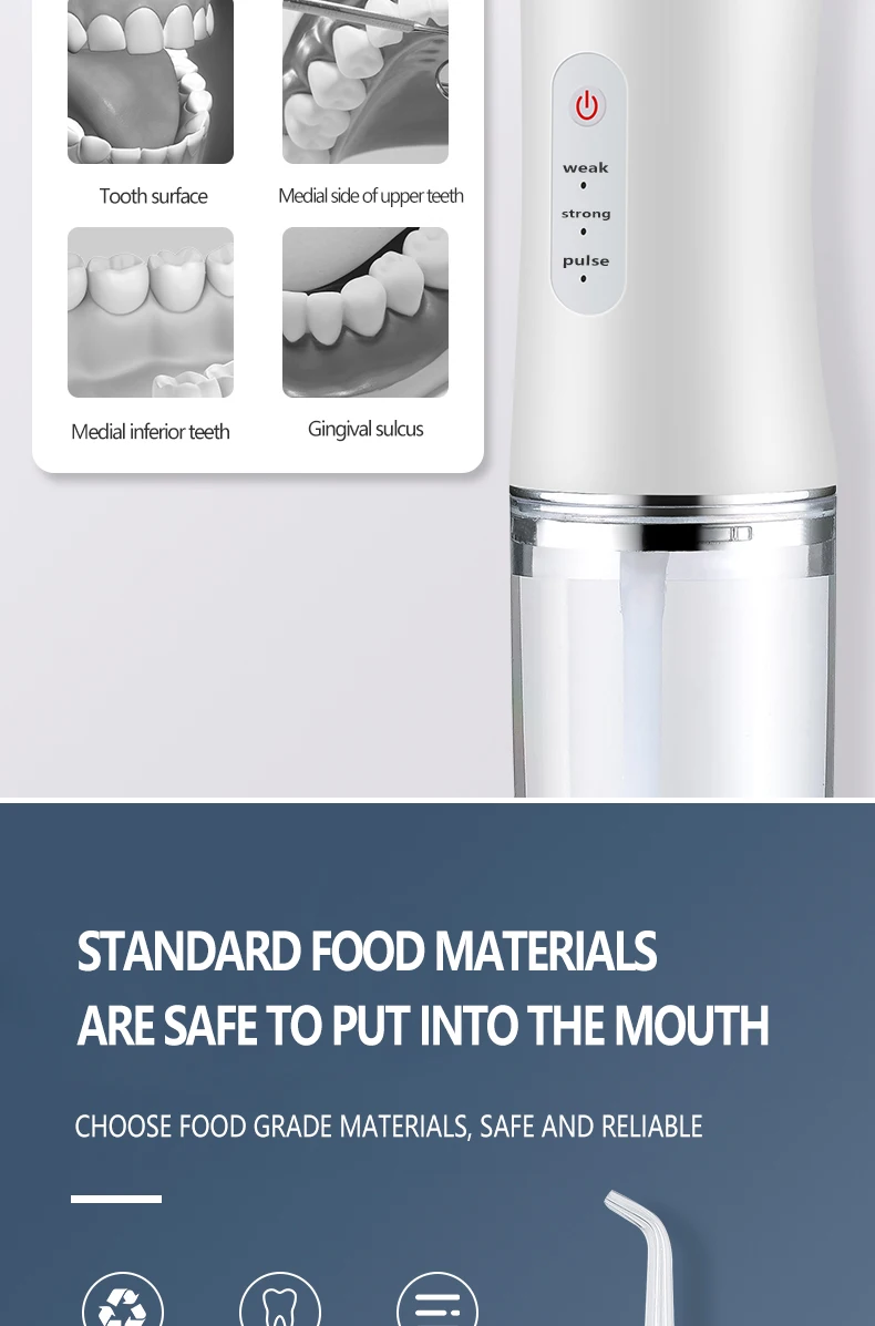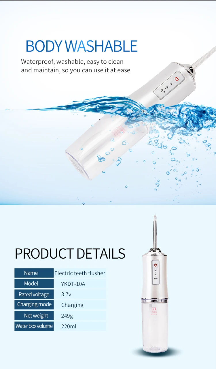Спецификация:Номинальное напряжение: 3,7 VНоминальная мощность: 5 ВтСрок службы батареи: около 4 чВодонепроницаемость: ДаЕмкость аккумулятора: 1200 мАчЕмкость резервуара для воды: 330 млОсобенности:1. Легко носить с собой, сопло можно положить в стаканчик для воды, чтобы работать в путешествиях, чтобы носить с собой в любое время и в месте для поддержания гигиены полости рта2. Струйная вода высокого давления, Глубокая чистка между зубами, отсутствие остатков, отсутствие повреждений десен, отсутствие кровотечения, легко адаптируется3. Три режима можно переключать свободно, слабый: нежное давление воды может быть очищено после еды; Сильный: сильное давление воды может глубоко очистить зубы; Пульс: чередование сильного и слабого давления воды для очистки зубного камня через высокочастотную вибрацию4. Высококачественный водяной насос и новый усовершенствованный интеллектуальный чип5. Материал для детского питания, сертификация безопасности, чистка зубов более безопаснаВращающаяся насадка на 6,360 ° может очищать рот под разными углами7. Все тело IPX7 водонепроницаемый все тело моющиеся для прямого использования даже в воде8. Четыре профессиональных насадки для удовлетворения различных потребностей полости рта