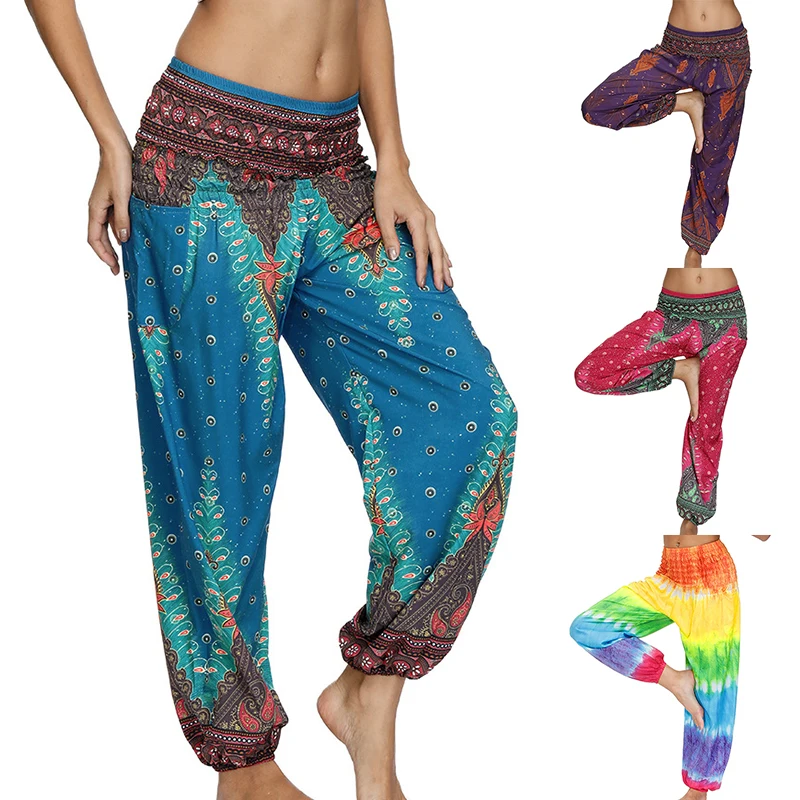 Женские свободные штаны для йоги, широкие брюки с цветочным принтом, длинные Стрейчевые штаны, свободные брюки палаццо, спортивные штаны, брюки в стиле Харлан, Прямая поставка
